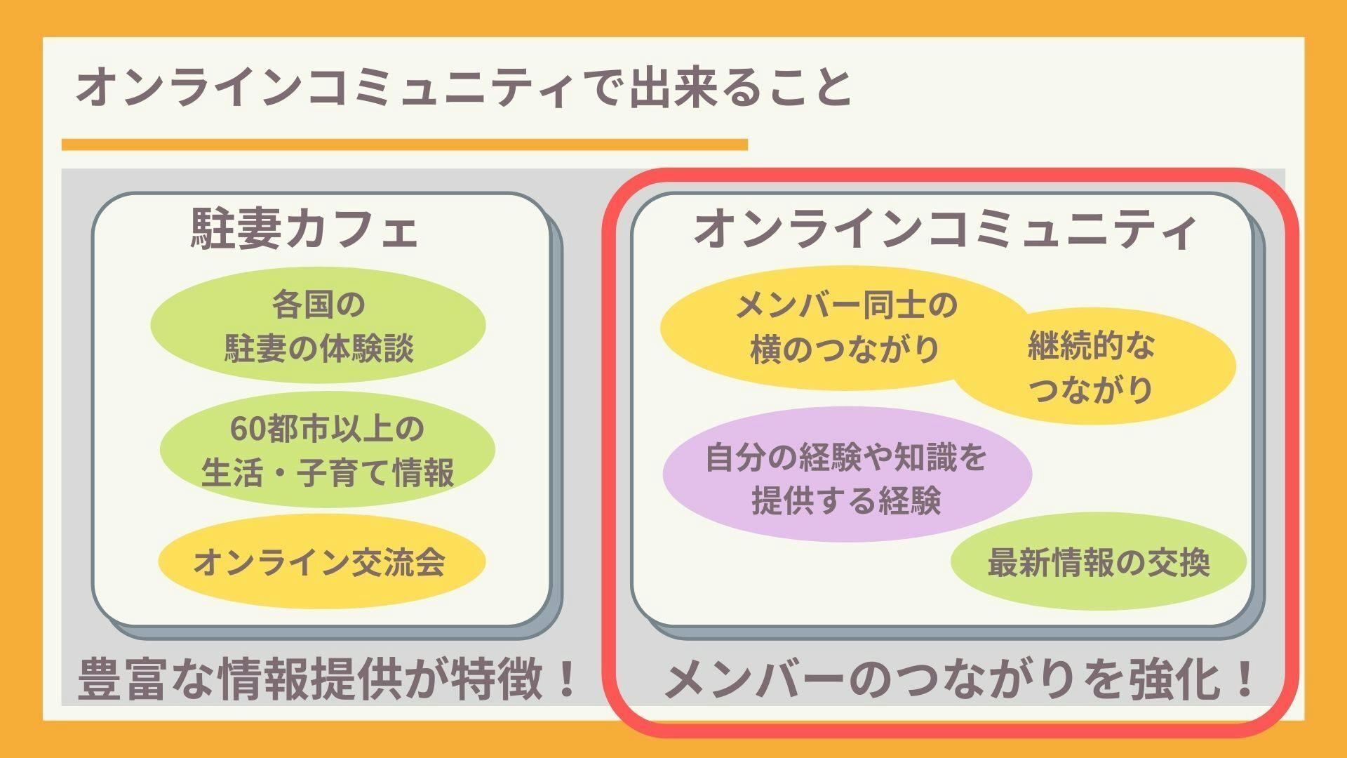 現在運営している「駐妻カフェ」では世界各地の60都市以上の生活に必要な情報、出産育児にまつわる情報や、60人以上の駐在に同行する妻の皆さんの体験談を掲載し、オンラインでの交流会も開催しています。