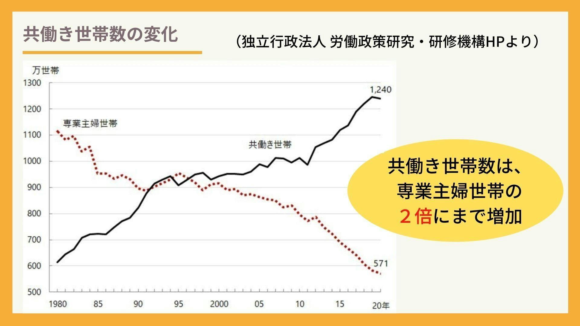 「海外駐在についていく妻」と「キャリア」という言葉が、すぐには結びつかない方も多いと思います。ですが、グラフの通り、この20年で共働き世帯数が専業主婦世帯数の2倍になっており、「妻の海外駐在についていく夫」も増えてきています。時代は大きく変わってきているのです。