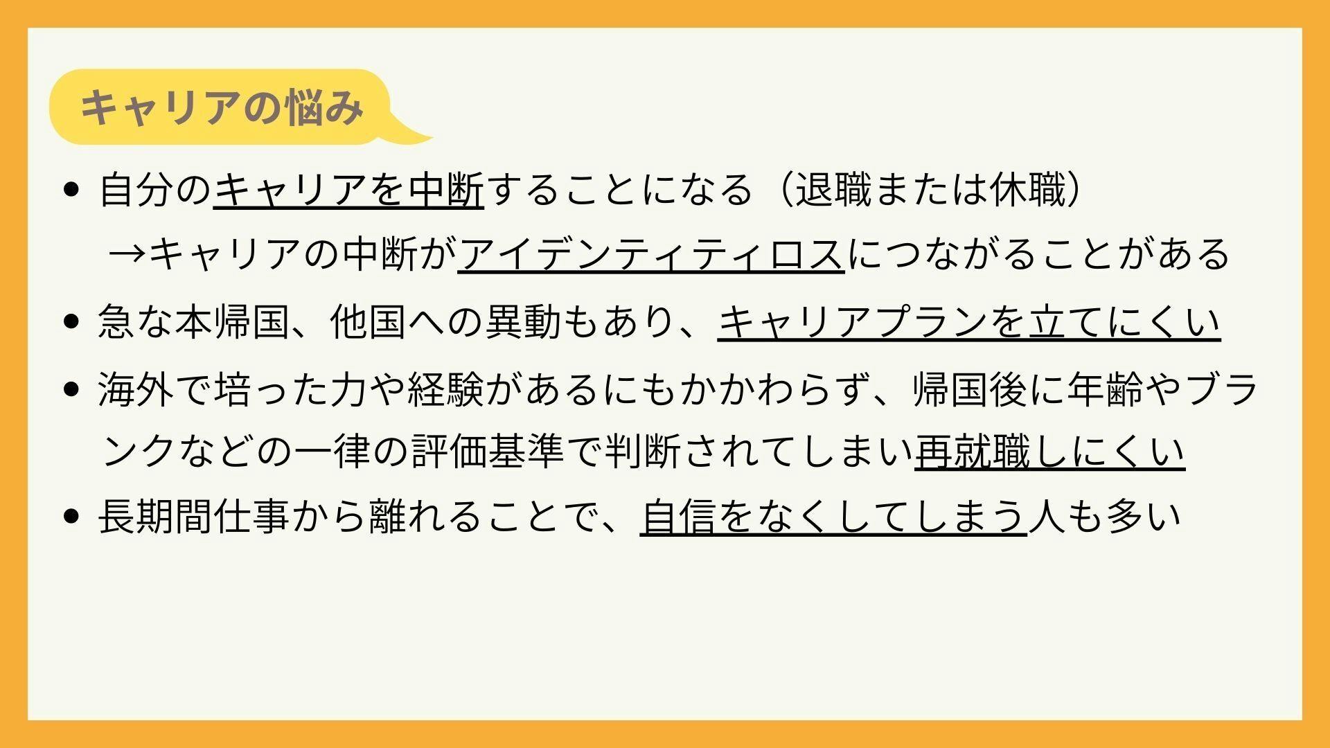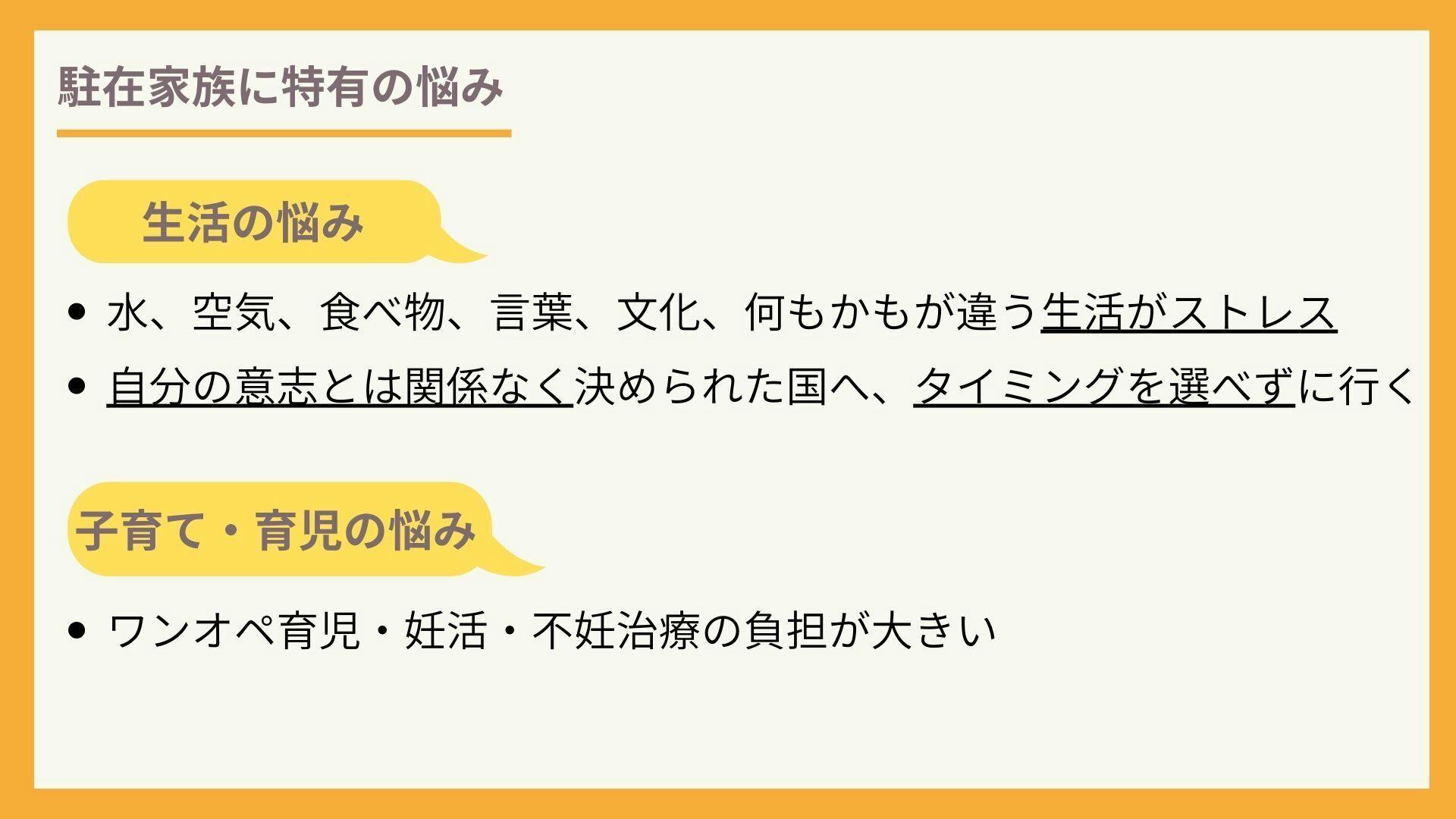 表面的には海外の素敵な写真をSNSにアップしていても、心の中では常に孤独感、不安感を持っていることもあります。海外駐在員としてキャリアアップしている配偶者に対して複雑な感情を抱くこともあります。更に、突然の本帰国や突然の他国への異動は珍しいことではありません。家族はそのたびに、生活環境を一から整える必要があるのです。自分自身のキャリアプランを描くことすら、ままなりません。