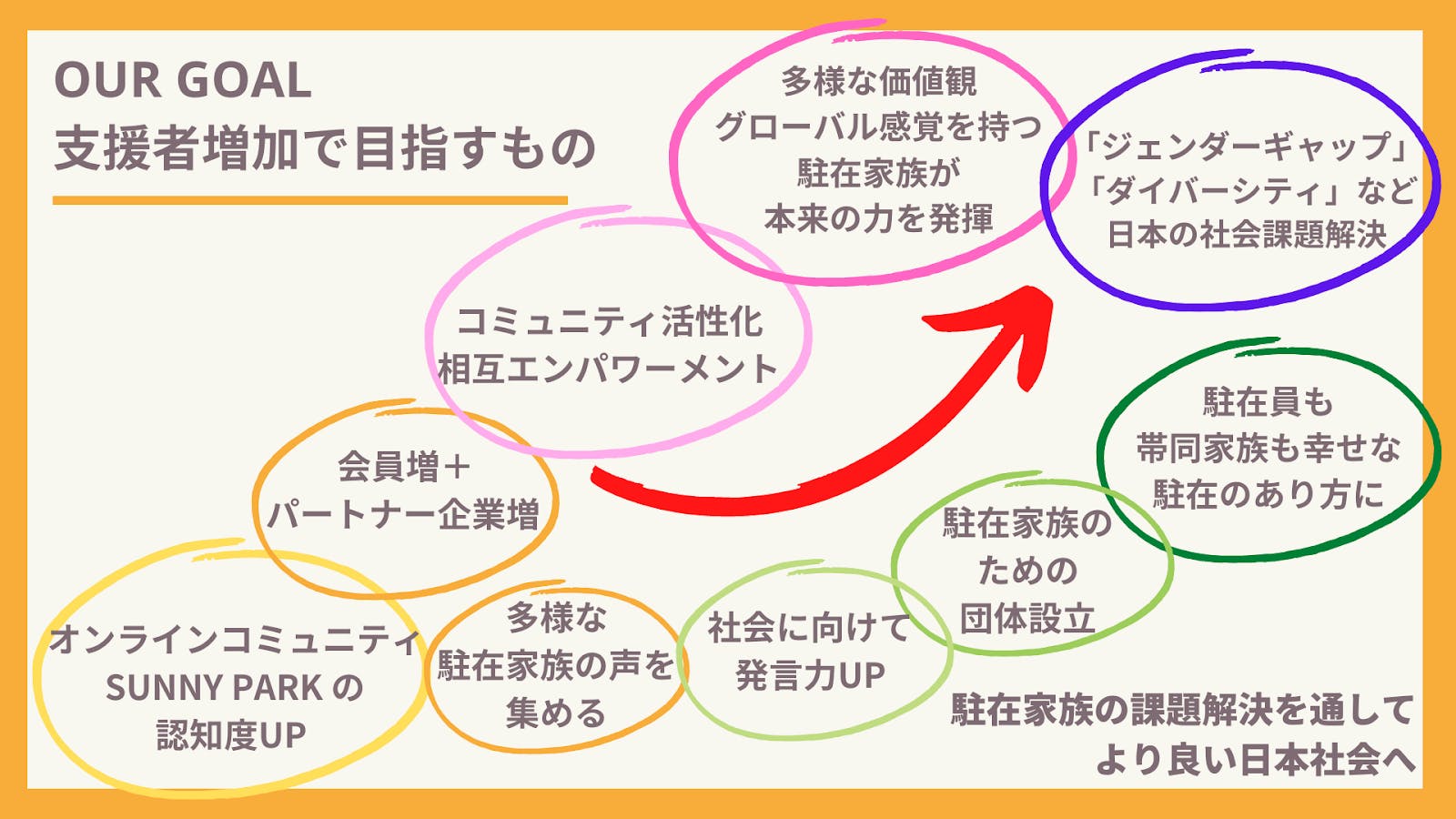 また、SUNNY PARKの認知度が上がり、多くの駐在家族に参加いただくことで、その方々が帰国後に経験を活かして、日本の「ジェンダーギャップ解消」、「ダイバーシティ推進」などの課題解決を推進し、より良い日本社会にしていくことを目指します。