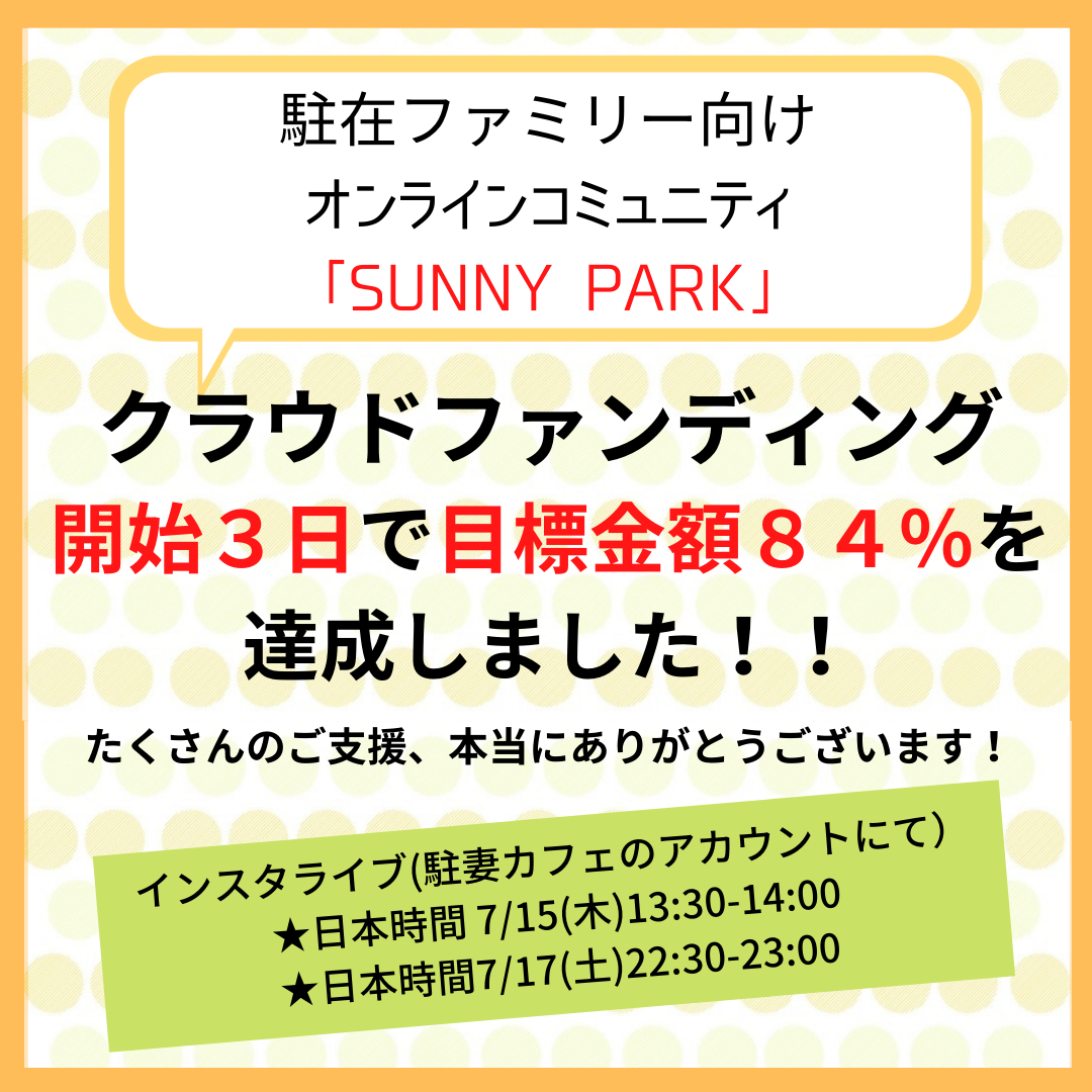 こんにちは。駐在ファミリー向けオンラインコミュニティ「SUNNY PARK」立ち上げメンバーです。ドキドキしながら始めたクラウドファンディングですが、開始3日で目標金額84%達成しました!支援者も53名を超え、たくさんの方の応援コメントに胸が熱くなっております。本当にありがとうございます!頂いたコメントの一部をご紹介します。・いつも勇気をありがとうございます。駐妻な人も、そうでない人も、みんなが輝ける社会になりますように。・この輪がもっともっと広がっていきますように。・私自身もこういう場所を求めていました。・世界中で頑張っている駐妻の皆さまが、駐在中もその後の人生もイキイキとしていられるよう、寄り添ってくれるコミュニティだと感じました。・リターンは大変な思いをして本帰国した友人へのプレゼントにしたいと思います!頂いたコメントを読ませて頂くと、駐在妻・夫の不安・課題を感じている方がたくさんいらっしゃり、改めて「駐在ファミリー向けコミュニティの必要性」を感じています。引き続き目標達成に向けて、頑張ってまいります!今週は、代表の飯沼ミチエと立ち上げメンバーにてインスタライブを行う予定です。★日本時間7/15(木)13:30〜14:00 コミュニティ設立への思いetc★日本時間7/17(土)22:30〜23:00 クラファン開始からの振り返りetc駐妻カフェのアカウント(https://www.instagram.com/cz.cafe/)にて行います。