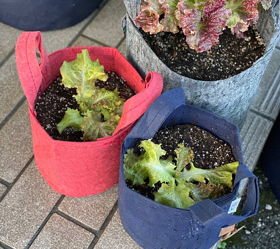 今日は、昨日購入したサニーレタスの苗を定植しました。ワンサイズ小さいサイズの布プランターに植えてみました。