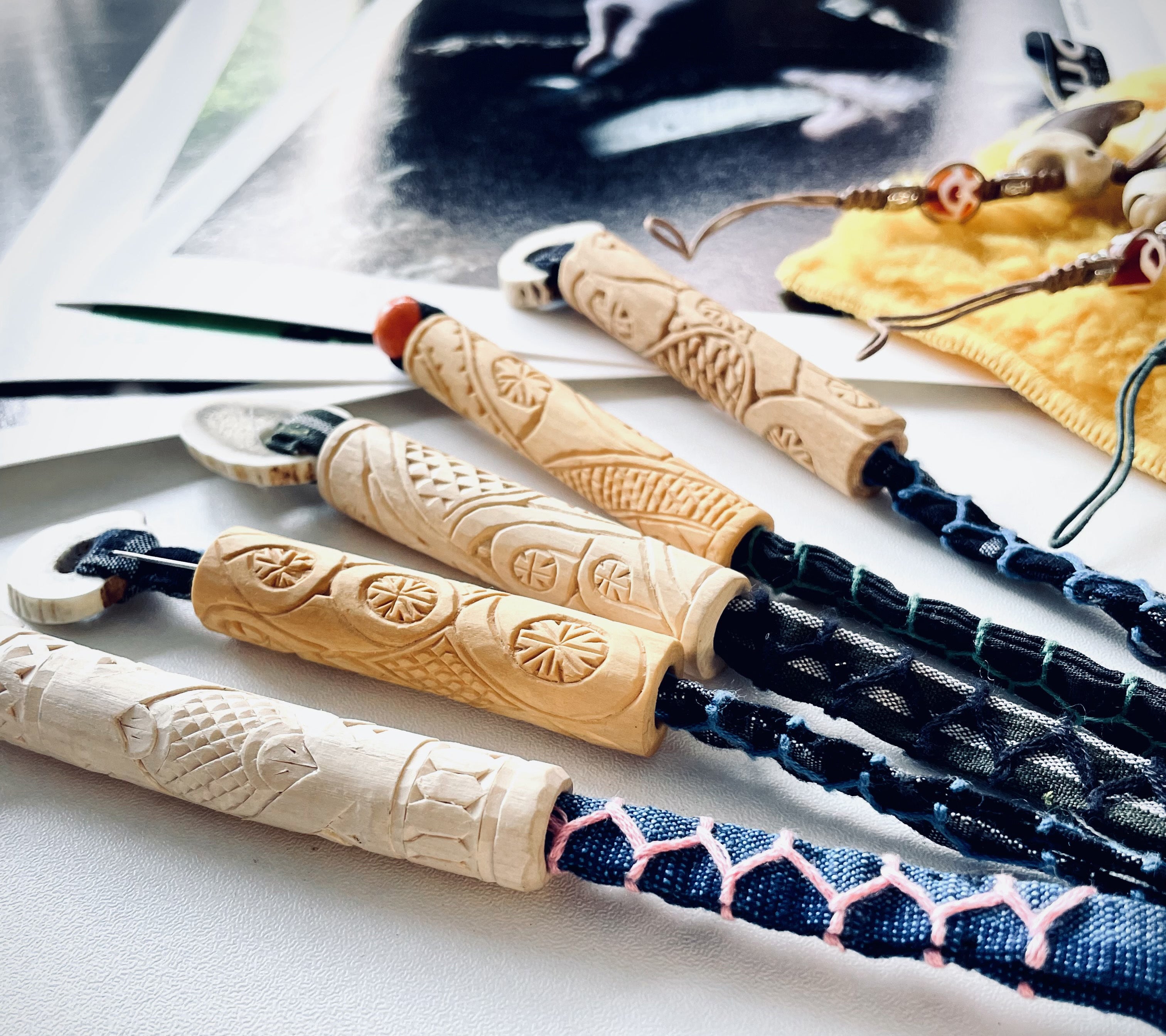 太八さん制作の「チシポ(針刺し)」。5点だけですが手に入りましたので、新しくリターンに設定いたしました。今では、「チシポ」を作られる方も少なくなってしまっていると思いますので、珍しく貴重な品ですね。見たことの無い方も多いのではないでしょうか?「チシポ」とは、交易などで手に入れた鉄製の針を大事にしまう針刺しのことです。アイヌの女性にとって刺繍の針仕事は重要な役割でしたので、この「チシポ」を服に縫い付け胸元から下げ、肌見放さず大切に身に着けていたそうです。チシポに関する太八さんのコメントをリターンの欄にも掲載しましたがこちらにも載せておきますね。(サビタ=ノリウツギのこと)【太八さんコメント】子どもの頃、兄姉がサビタを取ってきて、内皮のぬめりをシャンプー代わりに使っていたのでサビタは身近なものであったんですよ。チシポを作る時にサビタの形状を思い出して、芯の空洞を生かし製作をしたんです。初めて製作したチシポの木綿部は三上マリ子氏に作っていただいたのを覚えているんです。太八さん制作の「熊爪ストラップ(小)」と「チシポ(針刺し)」のセット。数は少ないのですが是非、ご支援よろしくおねがいします!