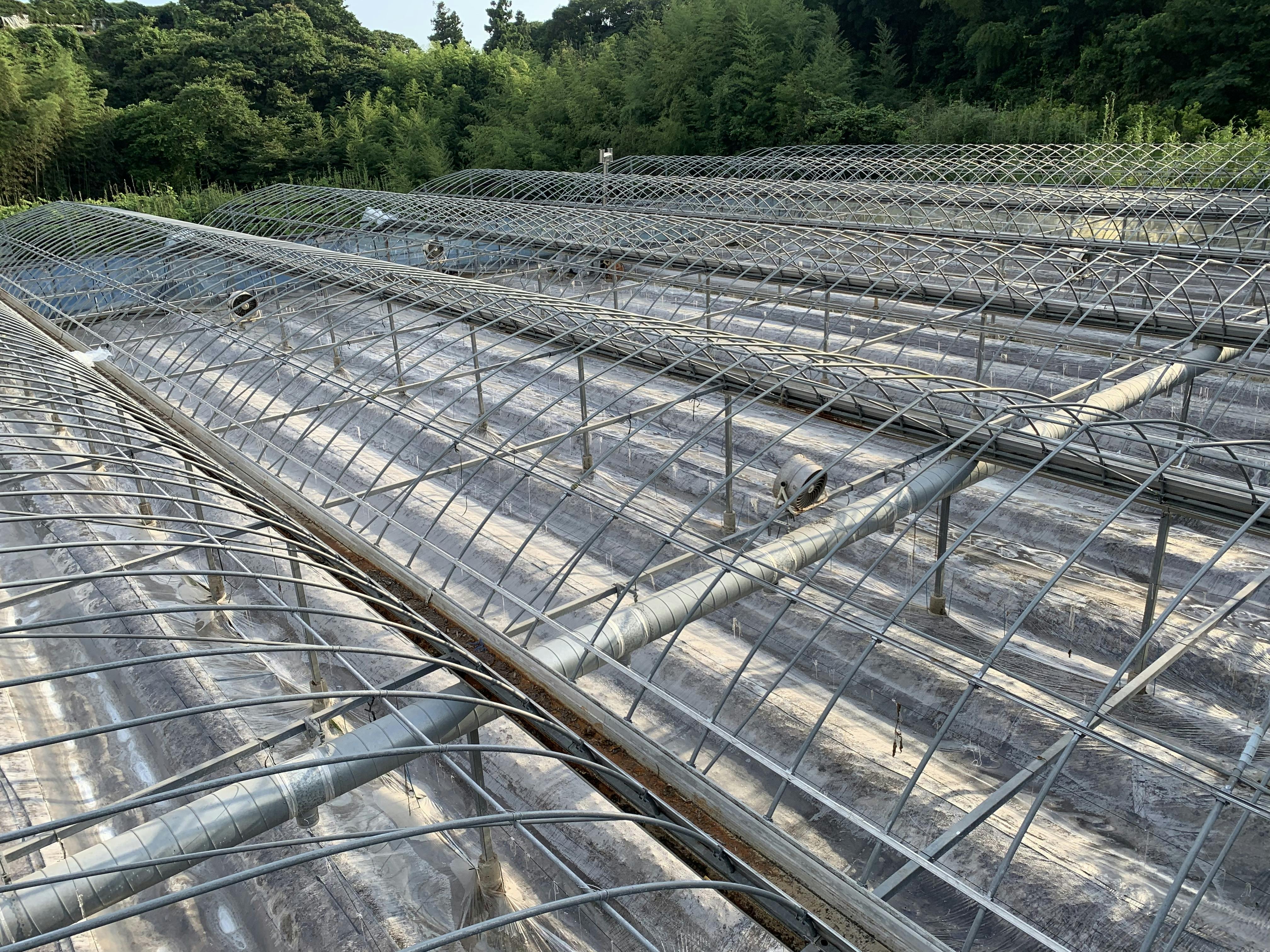 強い日差しを浴びながら3年に一度のハウスのフィルム交換作業をしています。