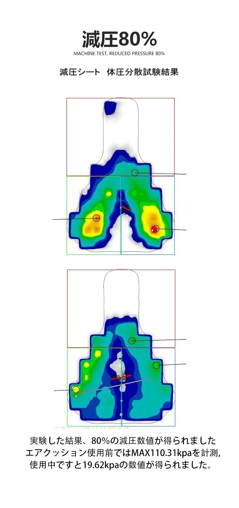 JFTの反重力自転車エアクッションを社内で体圧分散試験を行った結果、なんと!最大80%の減圧との結果が出ました!