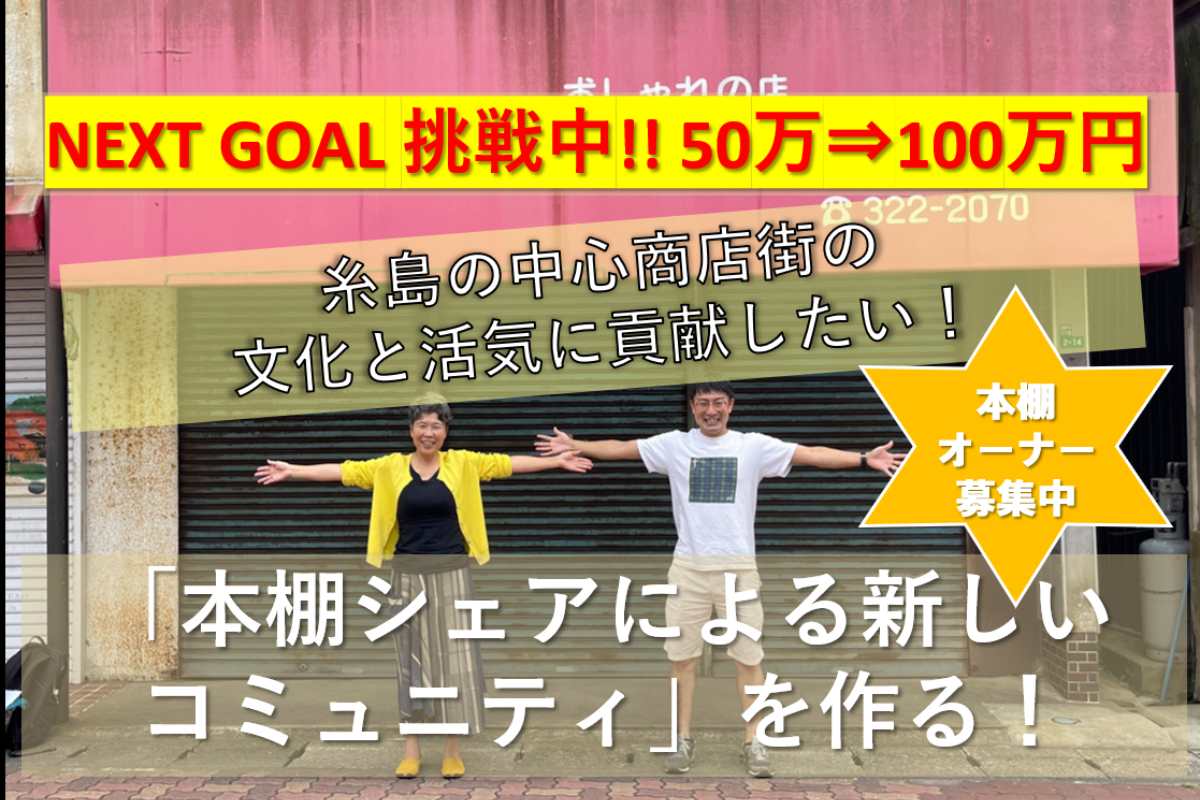 現在、本棚オーナー権取得に手を挙げてくださっている数は、目標の80棚に対し、その約1/4にあたる21棚です。特に糸島市民のみなさま、学生のみなさまにオーナーとしてご参加いただけると、大変嬉しく思います。ネクストゴールで集めたお金は、オーナーさん達の意見もいただきながら、本屋さんを開店するだけでなく、開店後にオーナーさんやお客さんにとってより魅力的な場所とするための資金としたいと考えています。