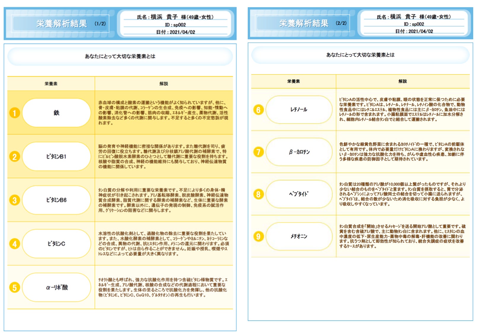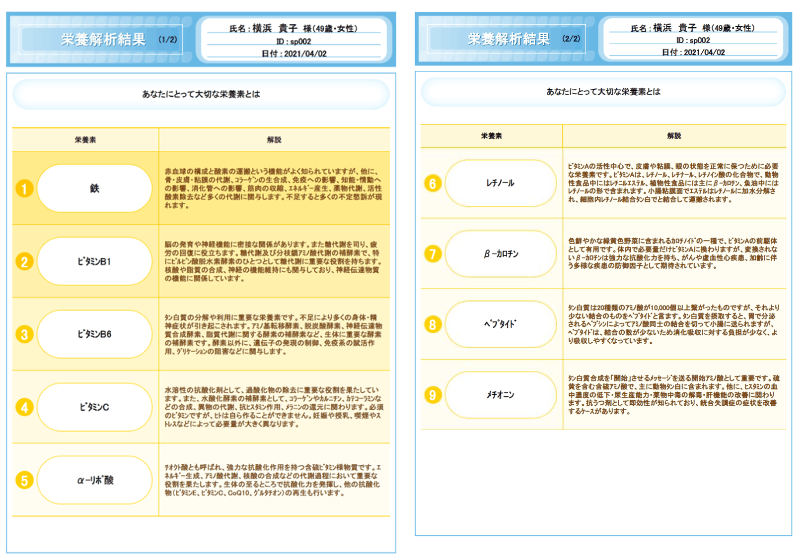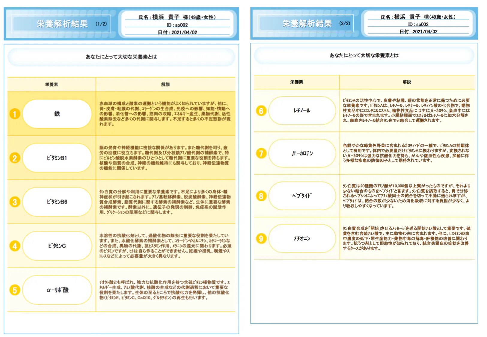 さまざまな体の不調を栄養の面から調べる検査です。採血の結果から、不足している栄養素をはじめ、消化吸収能力や炎症など、栄養の代謝に焦点を当てて調べることができます。本当に必要としている栄養素と普段の食事の工夫点について有資格者によるカウンセリングがつきます。(以下、デモ画面)