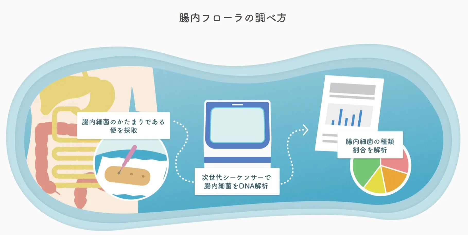 次世代シーケンサーで腸内細菌を遺伝子検査にかけ、腸内フローラの菌構成をゲノムレベルで正確に把握します。検便から腸内細菌の数や多様性がわかります。ご自身の腸内環境に合わせた食事や生活のアドバイスも行います。
