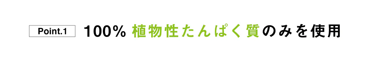 カゼインやホエイ等の動物性たんぱく質はいっさい使用せず、大豆たんぱく、えんどう豆たんぱく、玄米たんぱくをメインとした、植物性たんぱく質だけで構成しています。