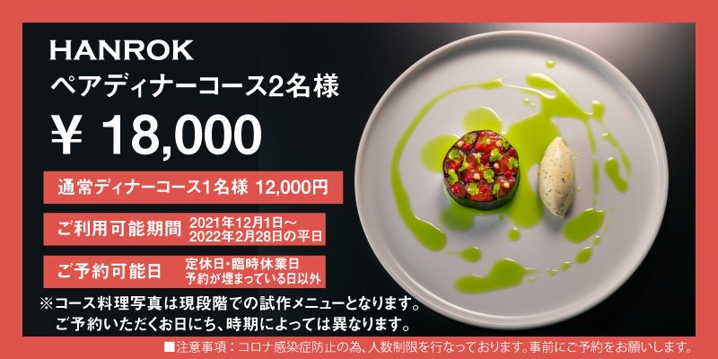 HANROK平日ペアディナーコース2名様24,000円(1名様12,000円)を
