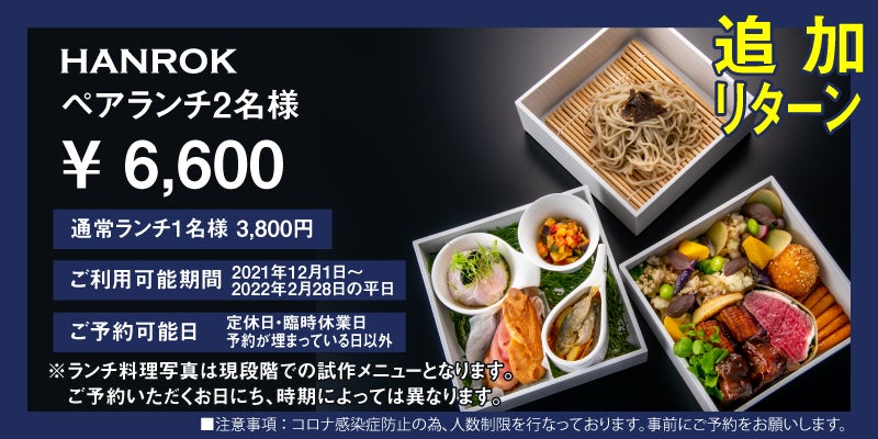 HANROK土日利用可能ペアランチ2名様7,600円(1名様3,800円)のランチを