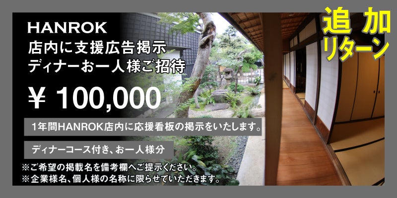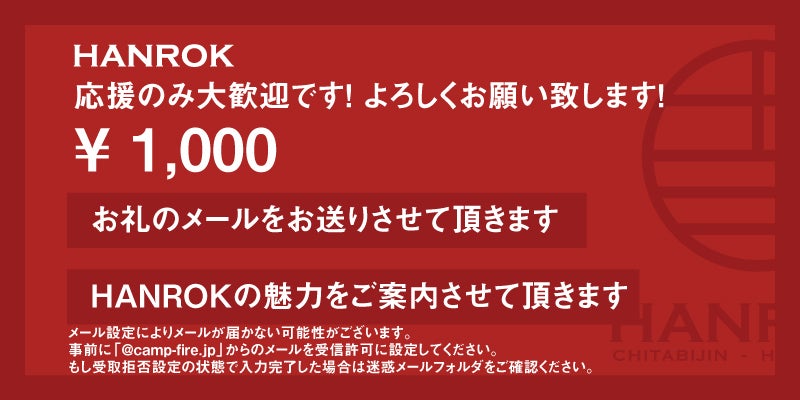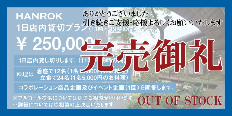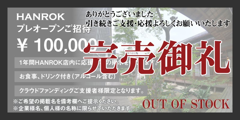 2021/10/20 22:00最後まで皆さまの温かいご支援ありがとうございました。2021年10月20日 23:59:59 までクラウドファンディングのリターンご支援可能となります。11月6日からのご予約受付を開始いたしました。お日にちお決まりの方は、当店ウェブサイトよりご予約お待ちしております。https://hanrok.jp/reservations/HANROK公式LINEの友だち募集を開始いたしました。QRコードの読み取り、又は下記リンクをクリックして友だち追加お待ちしております。https://liff.line.me/1645278921-kWRPP32q/?accountId=339rstrb もっと見る