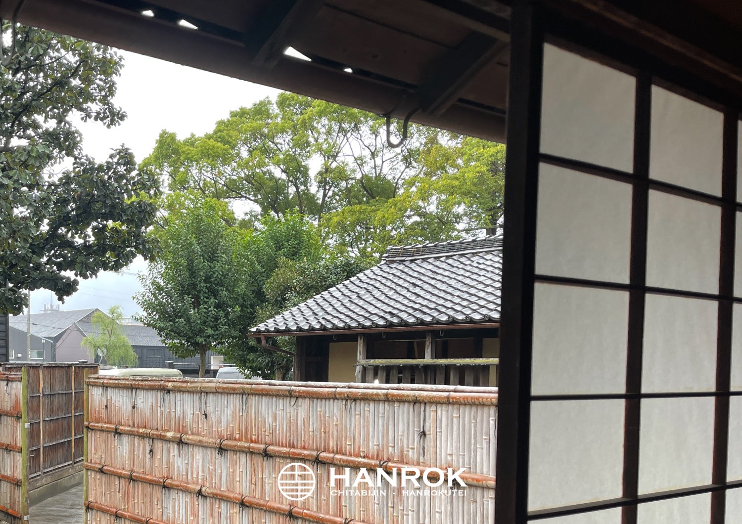 HANROK内から、雨の半六庭園、綺麗に整備された雨の半六庭園も良い雰囲気を醸し出しております。