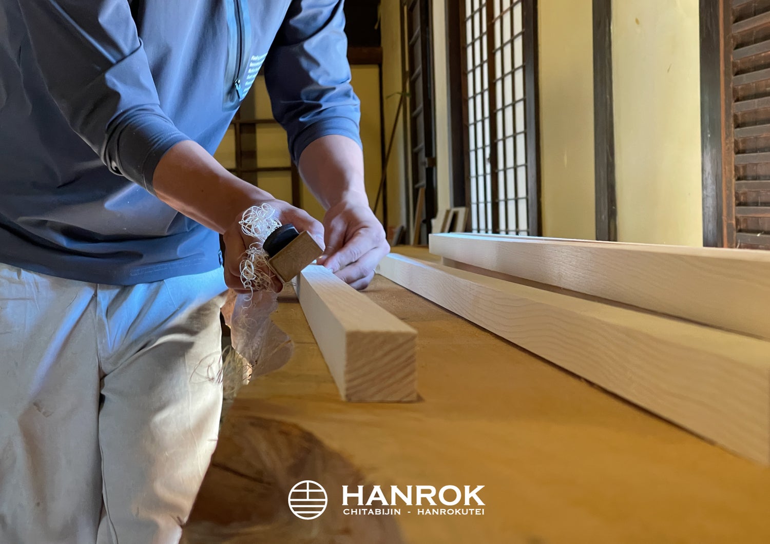 大工さんのカンナがけ作業、この25mm角のヒノキ材、お店のどこかに配置されます。