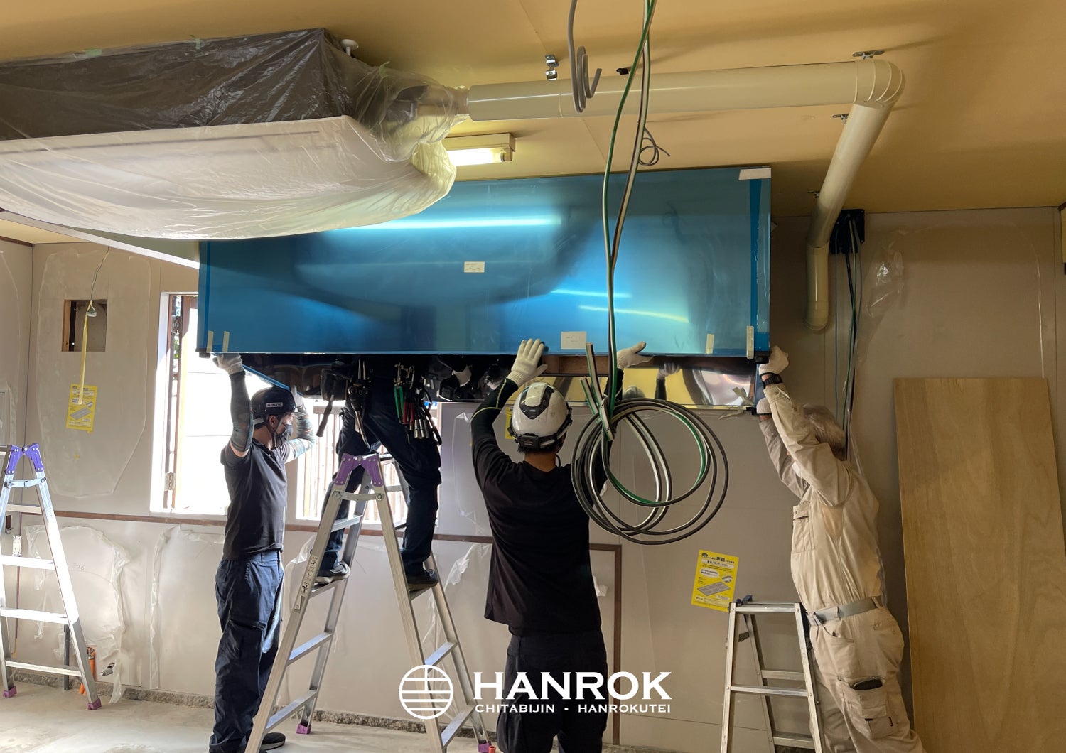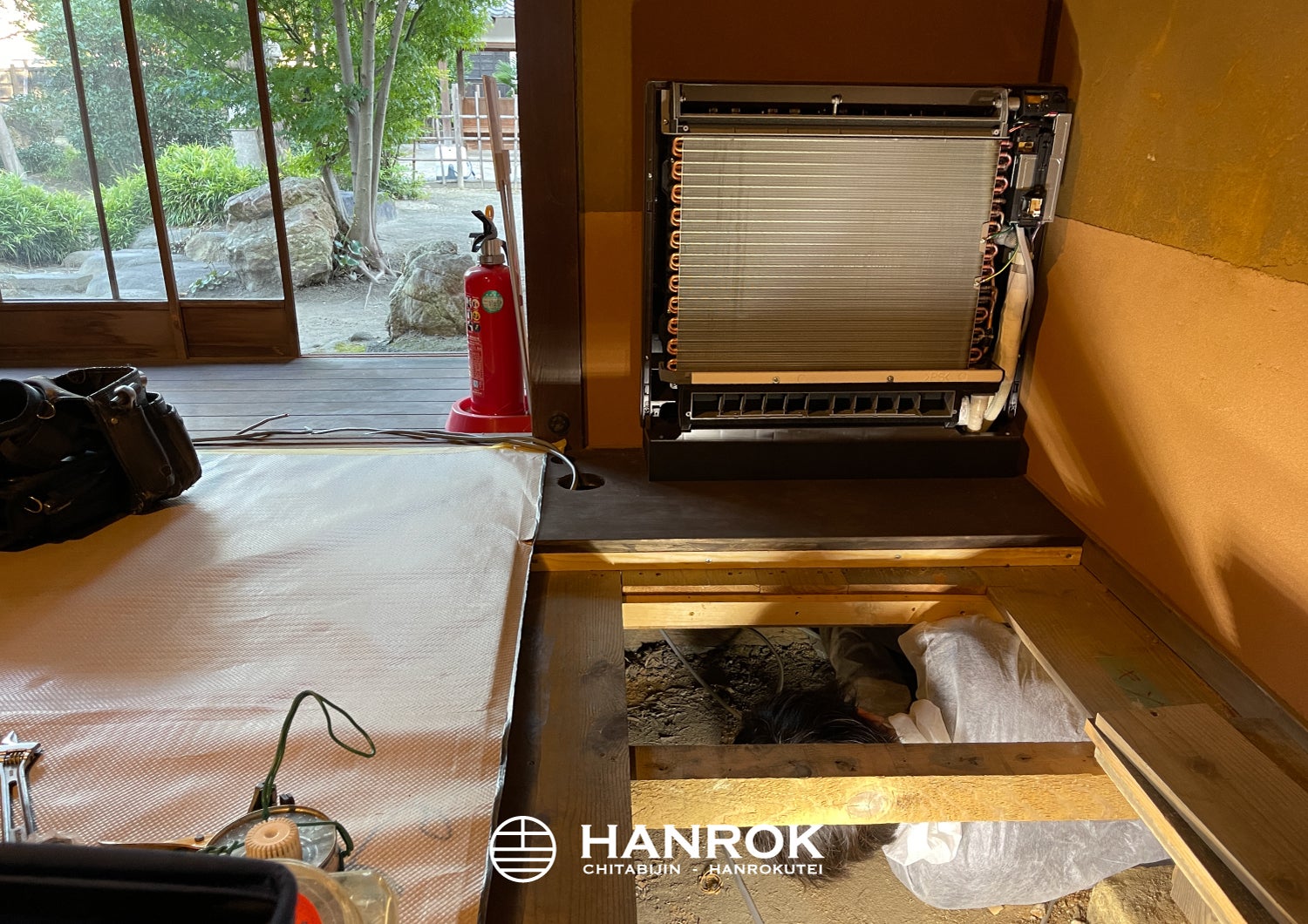 空調屋さんによる、旧中埜半六邸床下に潜っての取付工事