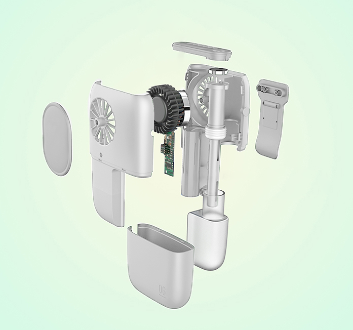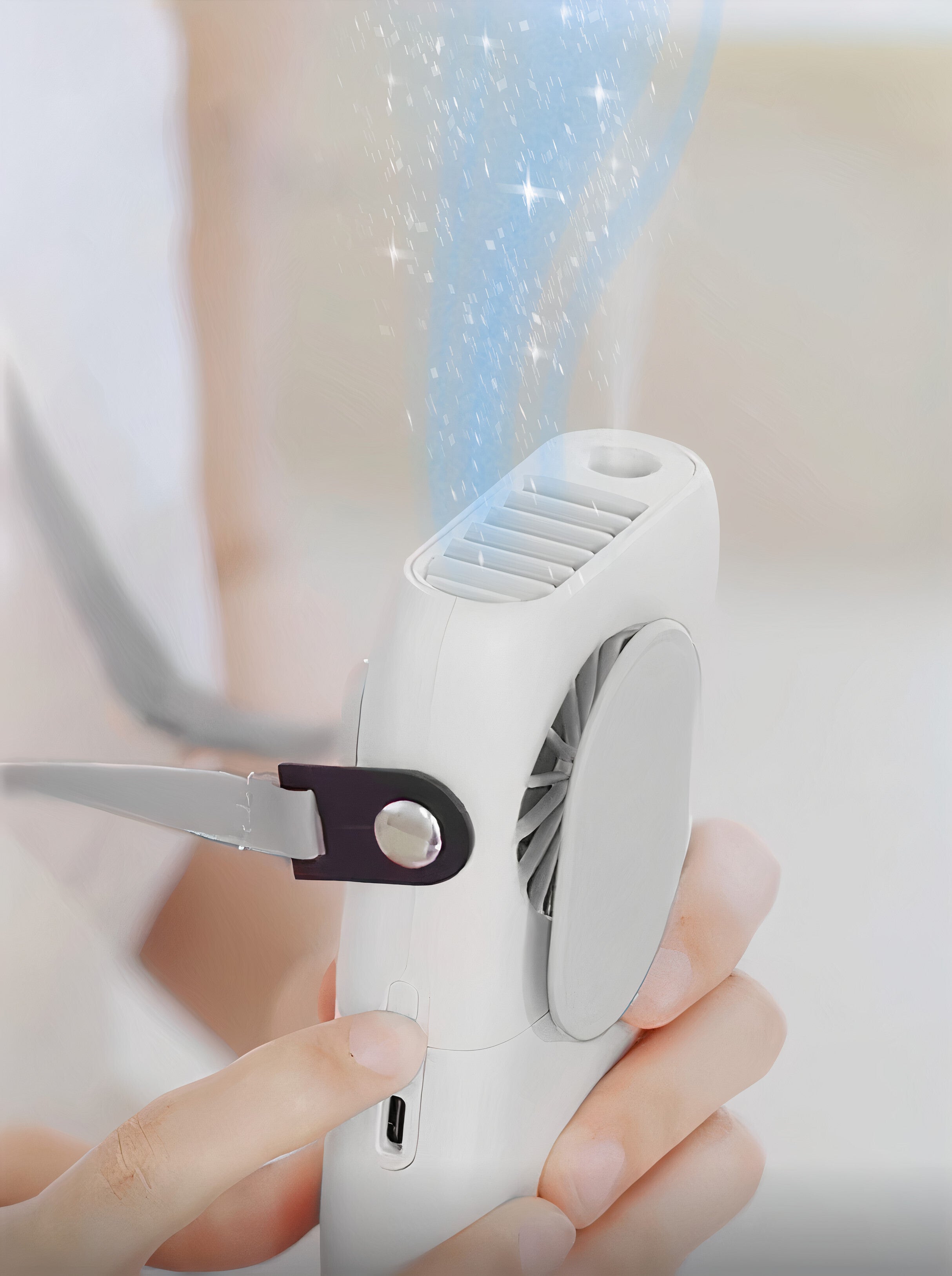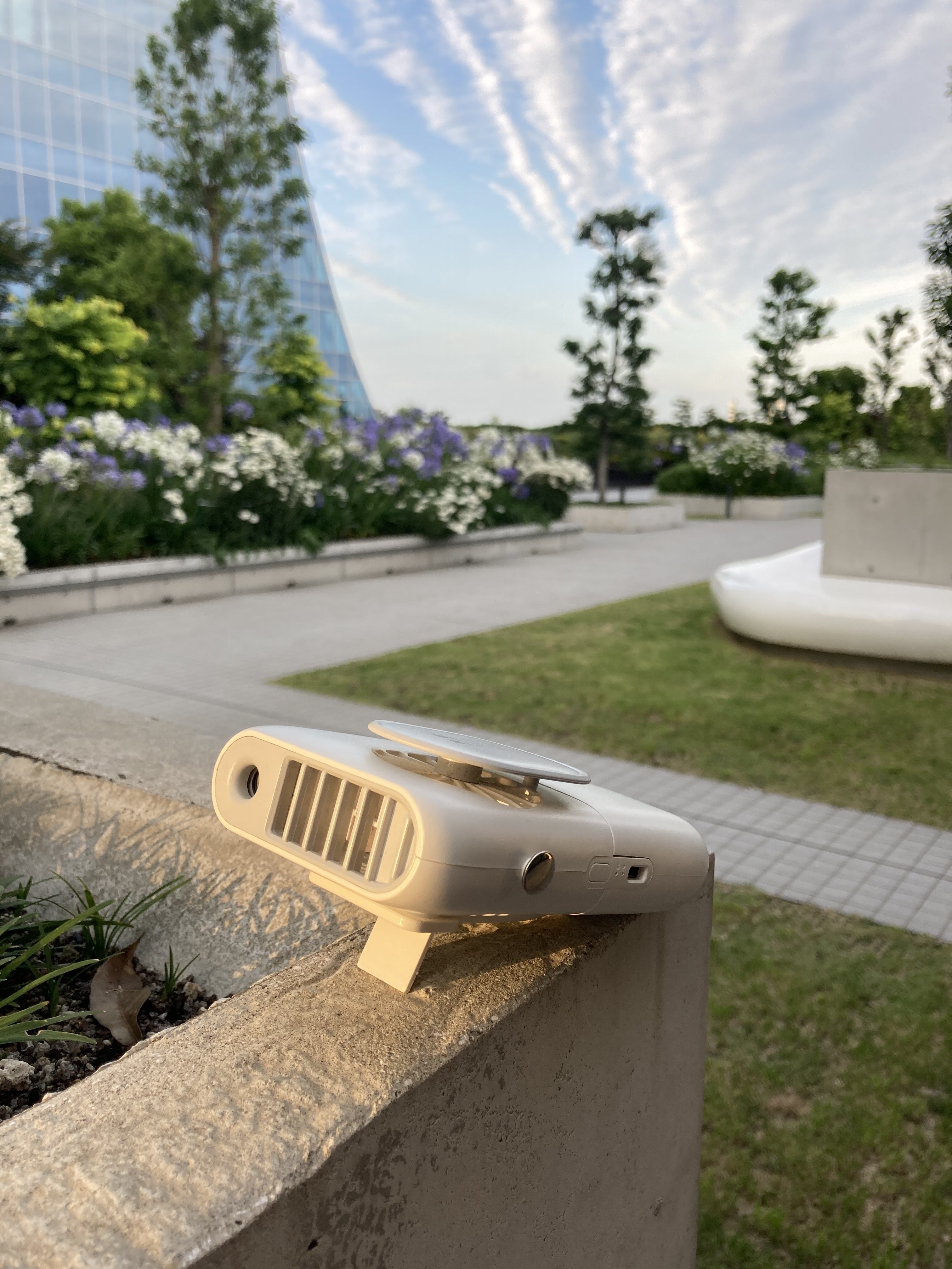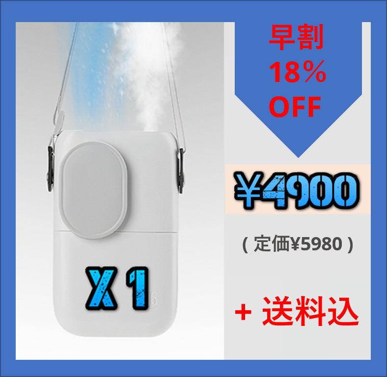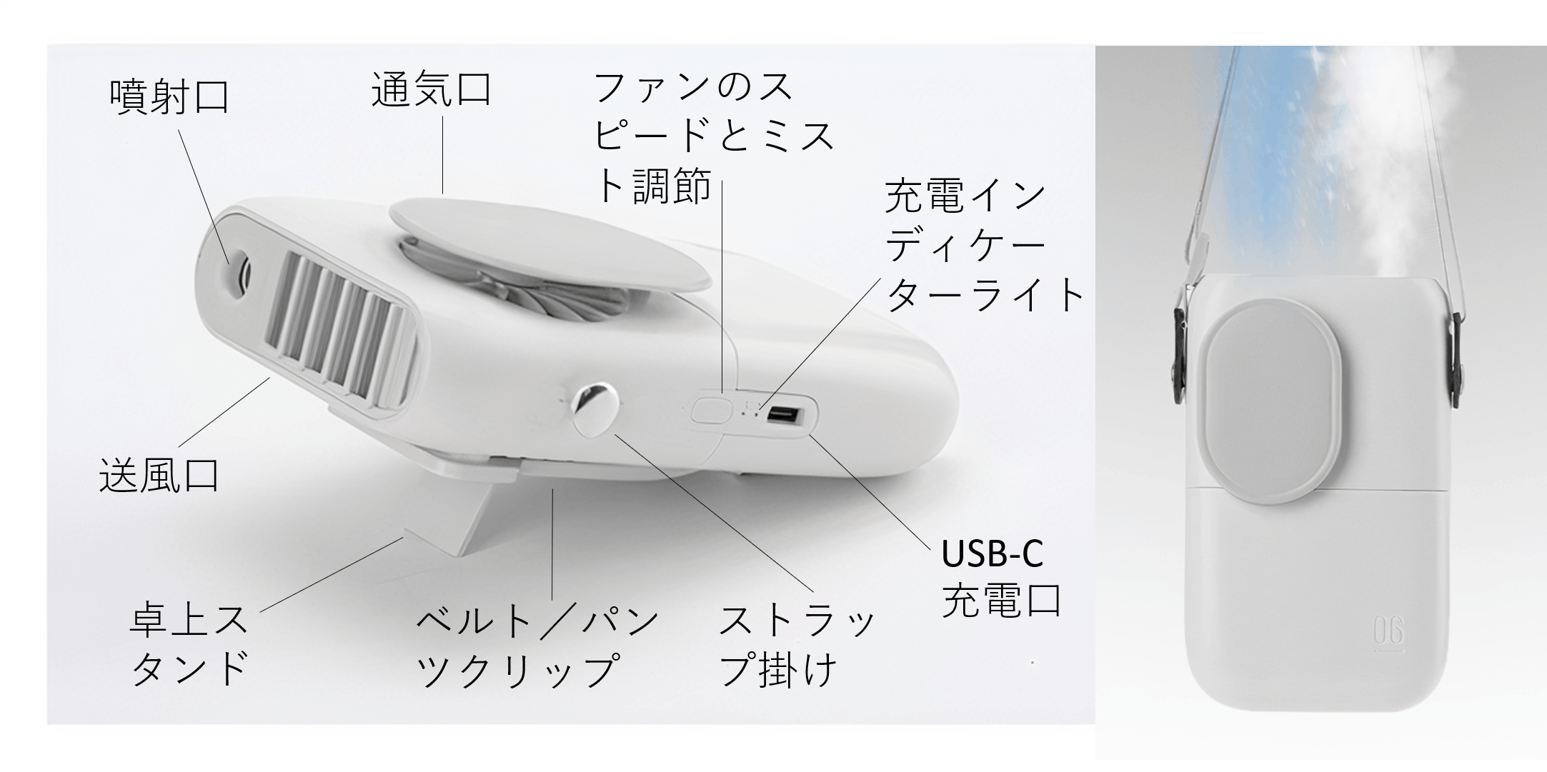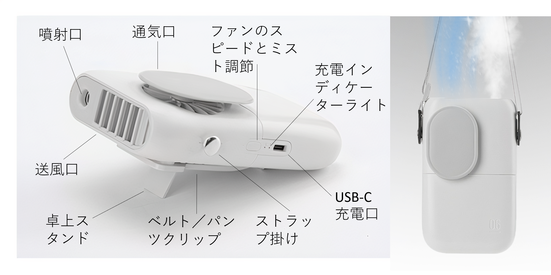 完全ハンドフリーなデザイン:シャツの下からの風が欲しい時には丈夫で大きなパンツ/ベルトクリップ。顎の下から冷風/ミストを噴射するにはストラップ。机の上に置くにはデスクスタンド。