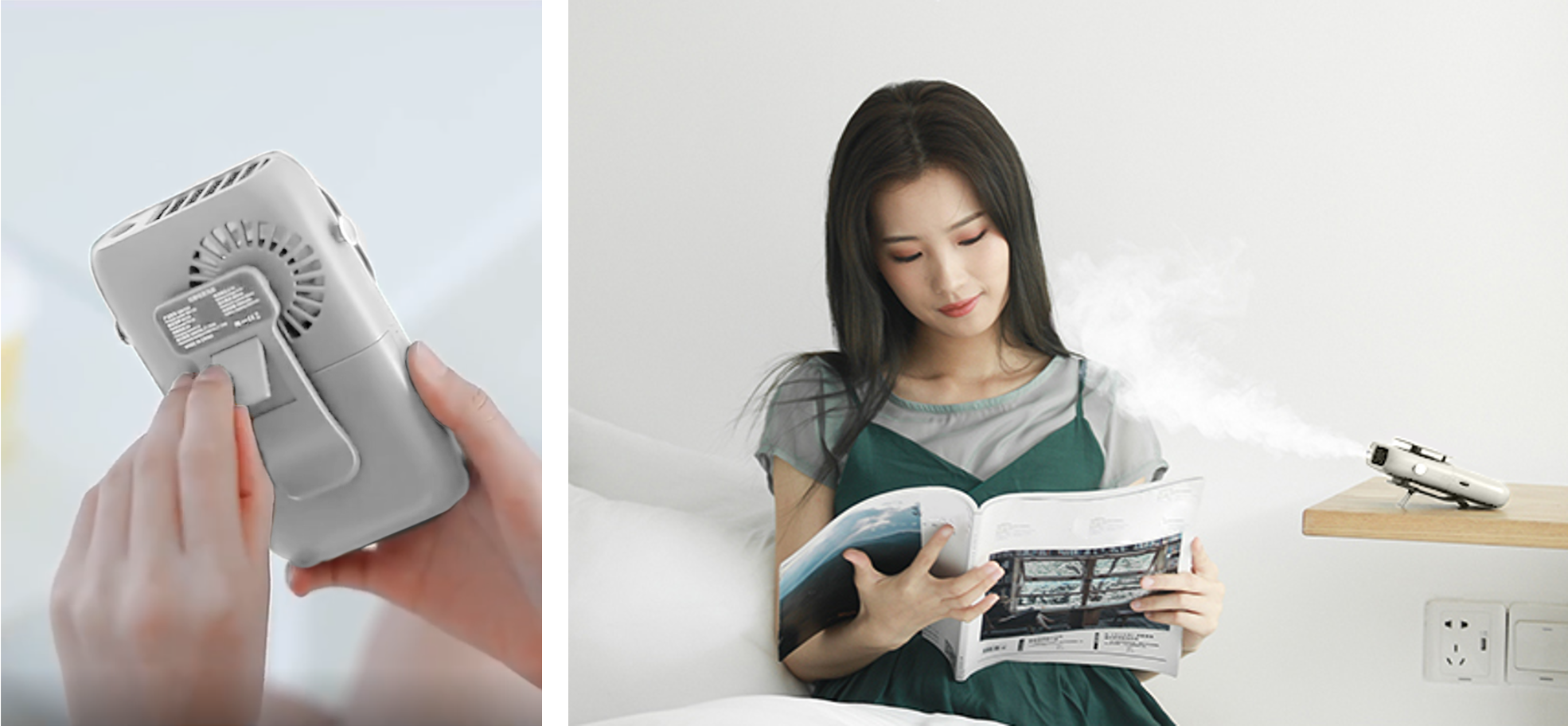 Cool Human®のハンズフリーポータブルミストボディクーラーは、裏側のつまみを引くとスタンドタイプにできます。机に置いて涼しい風を感じながらだと、お仕事もはかどりますね。