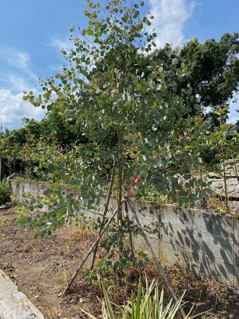 お店の建築予定地には一足先に、シンボルツリーに育てたいと思っている「ユーカリ」を植えています。オーストラリアなどでコアラが好んでその葉を食べるあの「ユーカリ」です。丸っこい、ハート形っぽい葉っぱが気に入って購入したのですが、ユーカリが育つオーストラリアでは山火事が起こることが多く、火事で緑豊かな自然から何もかも燃えてしまうこともしばしばあるのだそうです。しかし、燃えてしまった跡地に雨が降ると、ユーカリの種はまた芽を出し、育つのだそうです!そのことから、「復活の木」とも呼ばれるユーカリ。その力強さから生まれた花言葉は、「新生」「再生」だとされています。ユーカリの木のように、力強く、地域に根差した、お店を目指していきます!!