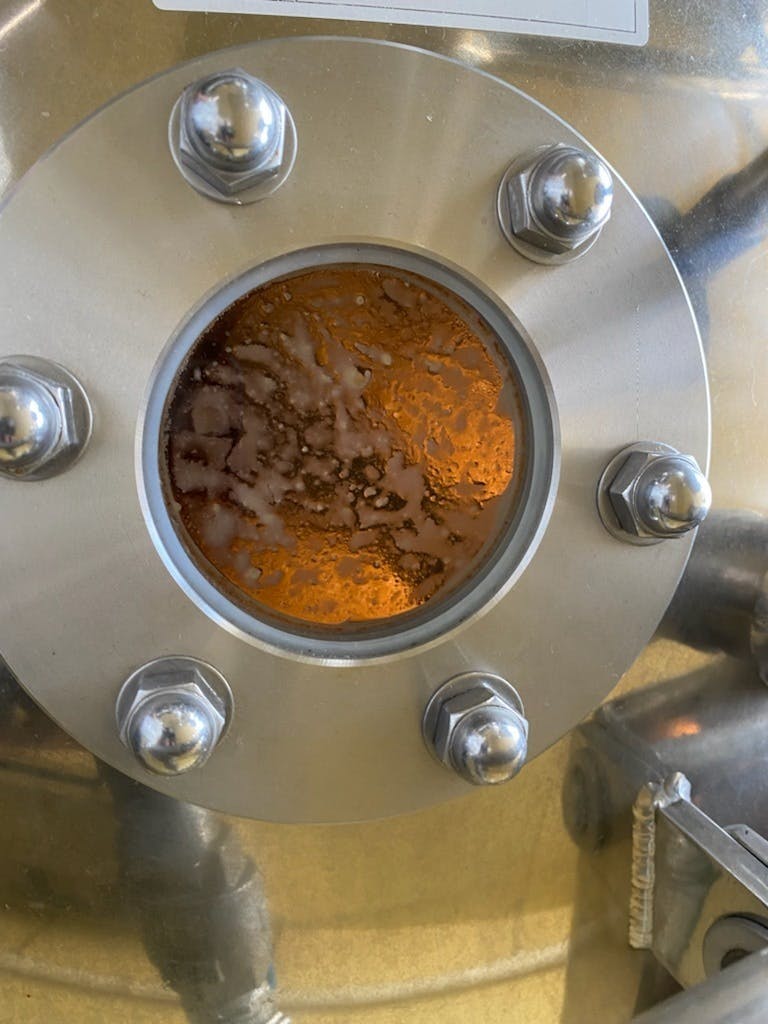 画像は低温真空釜に付いている小窓で、ここから中を覗きながら、鍋肌に付いているジャムの色や状態・トロミ具合など、ここに詳しくは書けませんが、様子をみながら調整します。