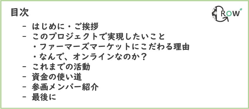 本プロジェクトはAll-or-Nothing方式で実施します。目標金額に満たない場合、『ONLINE × FARMERS MARKET』の開催及びリターンのお届けはございません。8月の開催をもって、GRowとしての『ONLINE × FARMERS MARKET』を閉じるつもりです。しかし、現在ご協力いただいている農家さんと協力し、また別の企画は実施するかもしれません。クラファンの達成が一番の目標ですが、達成できなくても、今一緒に歩んでいる方たちと農業に関する活動は続けていきます。