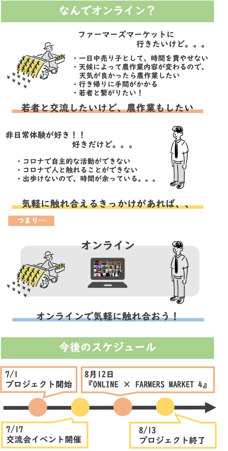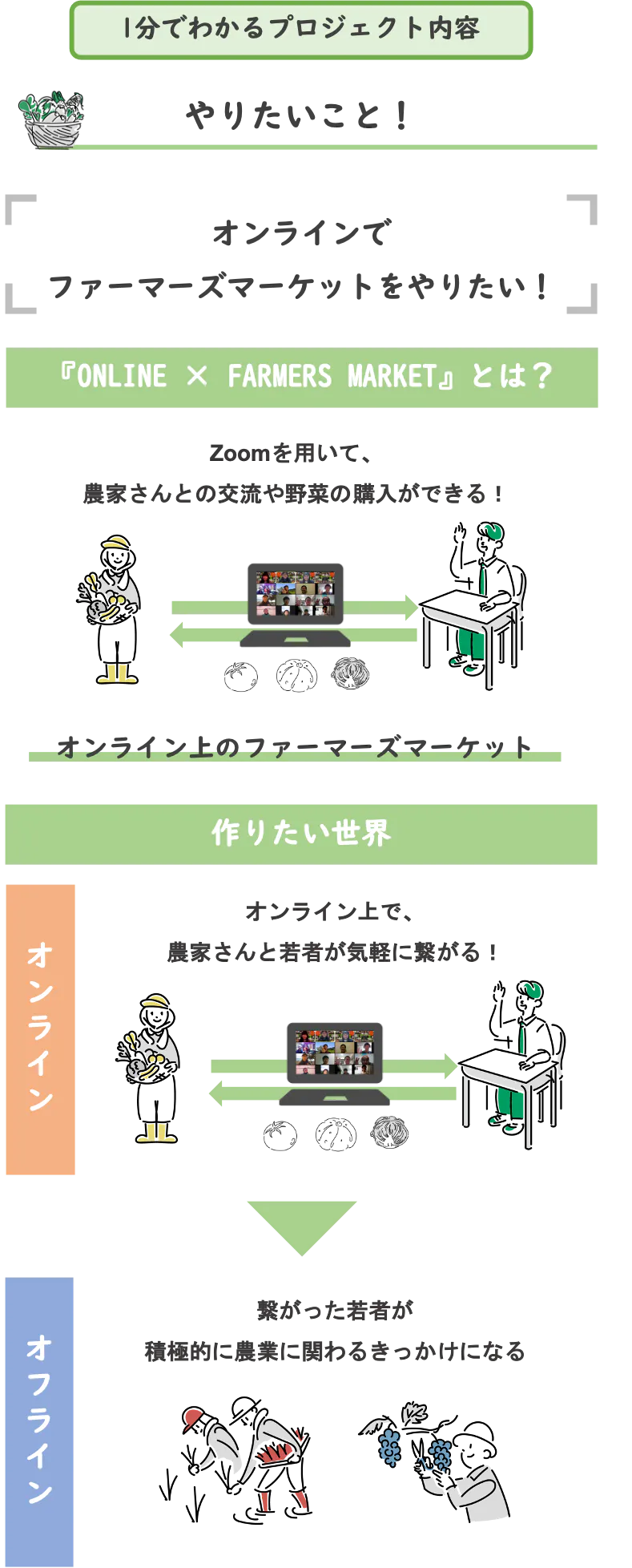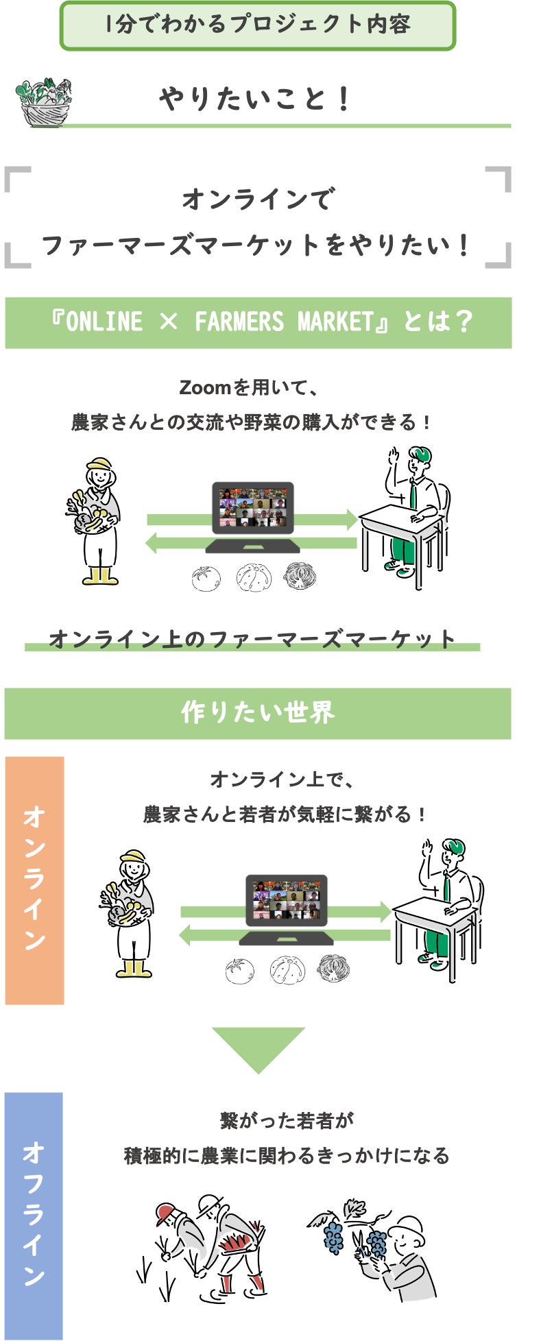 「私が何か力になれることはないか?」と思い、まずは人手不足の問題を改善するために「農業を学生の身近なものにしよう!」と考えました。現在は、主な活動である『ONLINE×FARMERS MARKET』を行なっています。