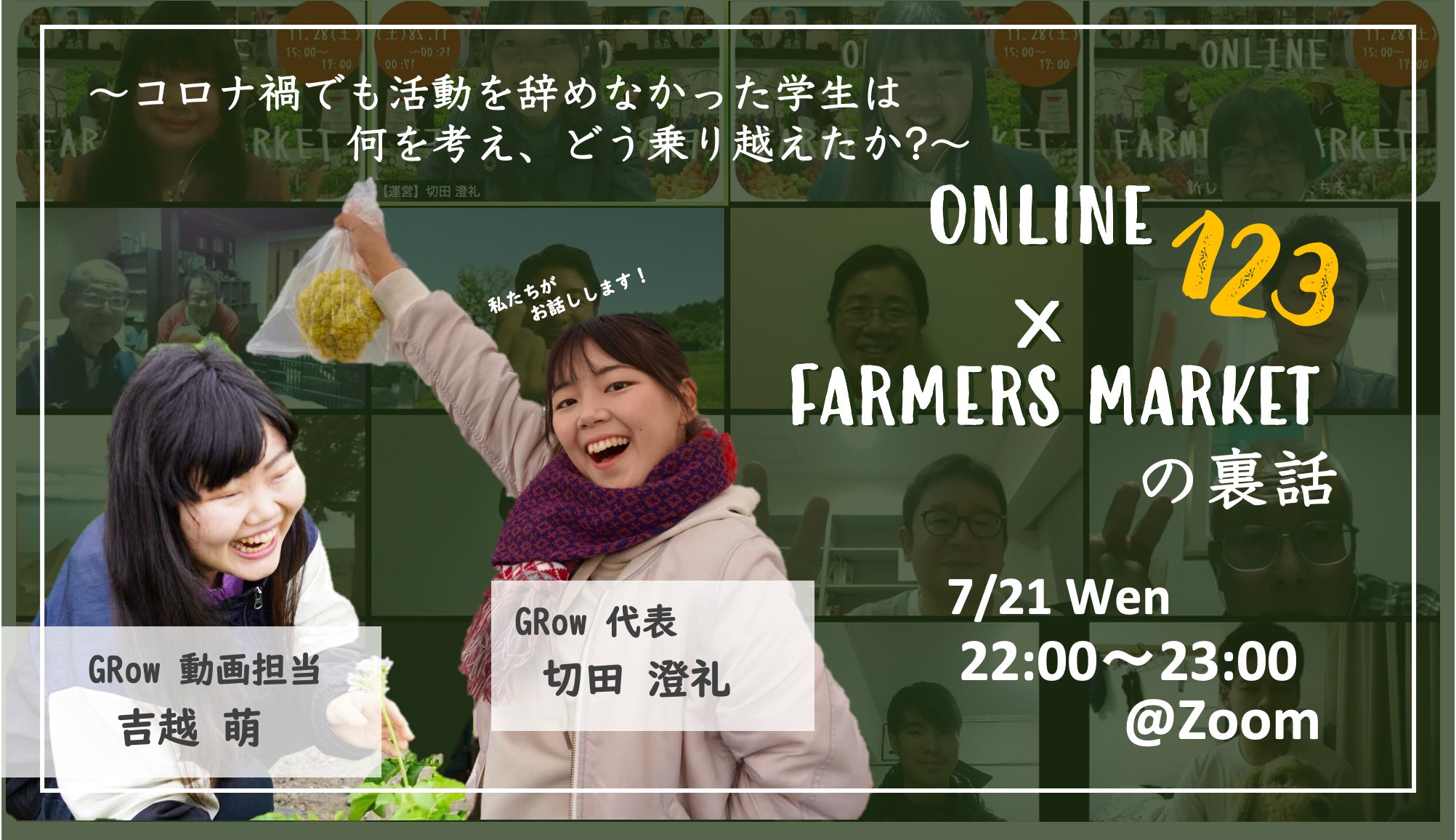 さて、応援したくださった皆様に向けて、私たち(GRow)から皆様とお話ができるオンラインイベント【『ONLINE × FARMERS MARKET 123』の裏側】を開催いたします。