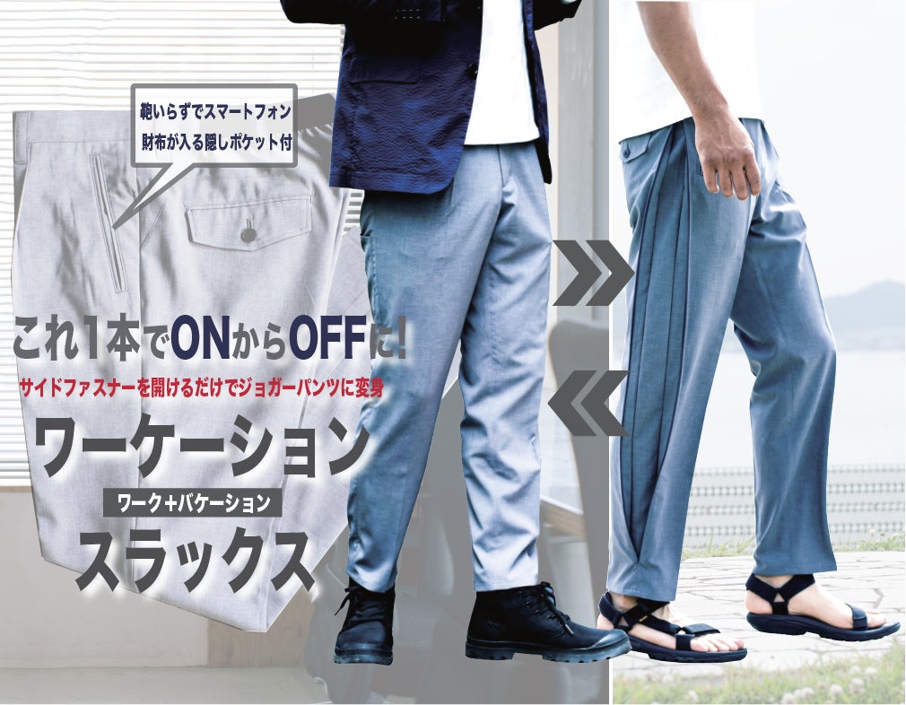 サイドファスナーを開けるだけで、ONとOFF2つのシーンに対応したワーケーションパンツの決定版。スマフォや財布がすっぽり入る鞄いらずの「スマイフィ」ポケット。素材はしっかりストレッチ、丸洗いできるノンアイロンでイージーケアー、吸汗速乾の多機能素材「アバン」採用。