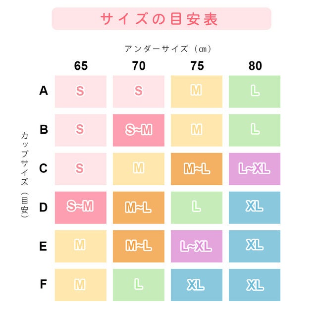 ※サイズの目安表はあくまでも参考用になります。着用感は個人差がございますので、予めご了承ください。ショーツサイズはブラと同じサイズになります。