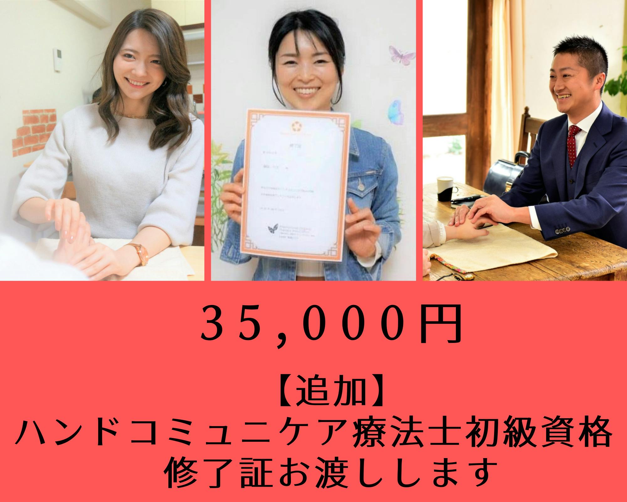 〇講座終了後、ハンドコミュニケア療法士初級修了証を授与します(対面講座は当日、オンライン講座は国内発送無料、海外は送料実費負担)