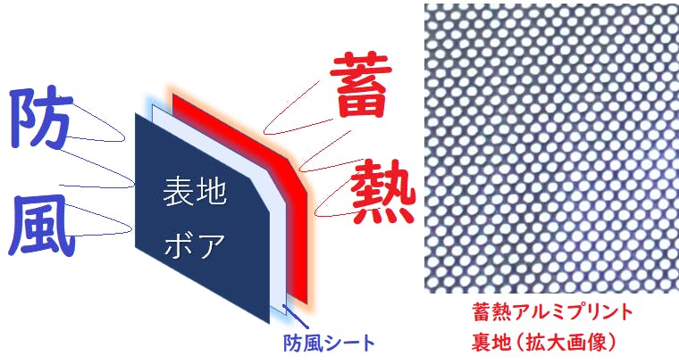 表地と裏地の間に防風シートを入れ3枚の素材をボンディングする(くっつける)事により、表地がボアなのに風を通さない素材の完成です!