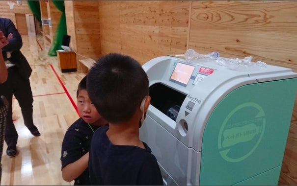 「子どもたちは会場に設置された「ボトルスカッシュ」という機械にペットボトルを入れ、圧縮する体験もしました。石油が原料のペットボトルを圧縮し回収して処理をすると、リサイクルして新たなペットボトルを作ることができるということです」