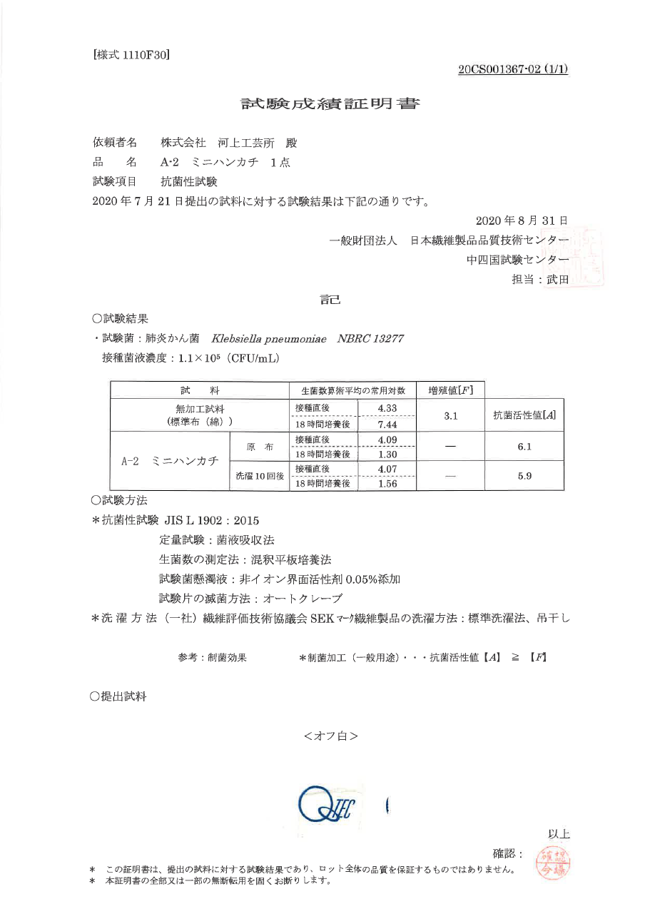 10回洗濯後、黄色ブドウ球菌と肺炎桿菌について、ともに抗菌活性値5.9