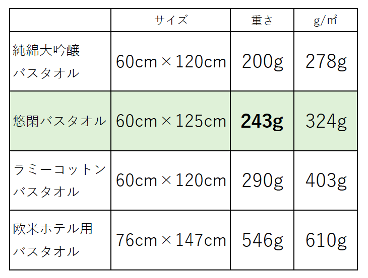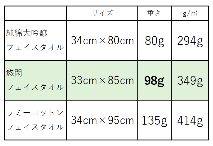 抗菌悠閑フェイスタオルは純綿大吟醸フェイスタオルより少し厚手の一般的な使いやすい重さです。