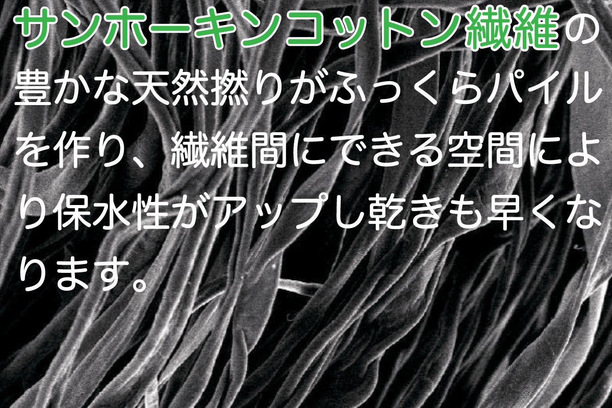 この天然撚りのおかげで、糸を紡いだ時に弾力性が生まれ反発力が増し、拭き心地の良いふっくらパイルのタオルになります。またこの天然撚りによって繊維間に空間が出来るので保水性がアップし乾きも速くなります。
