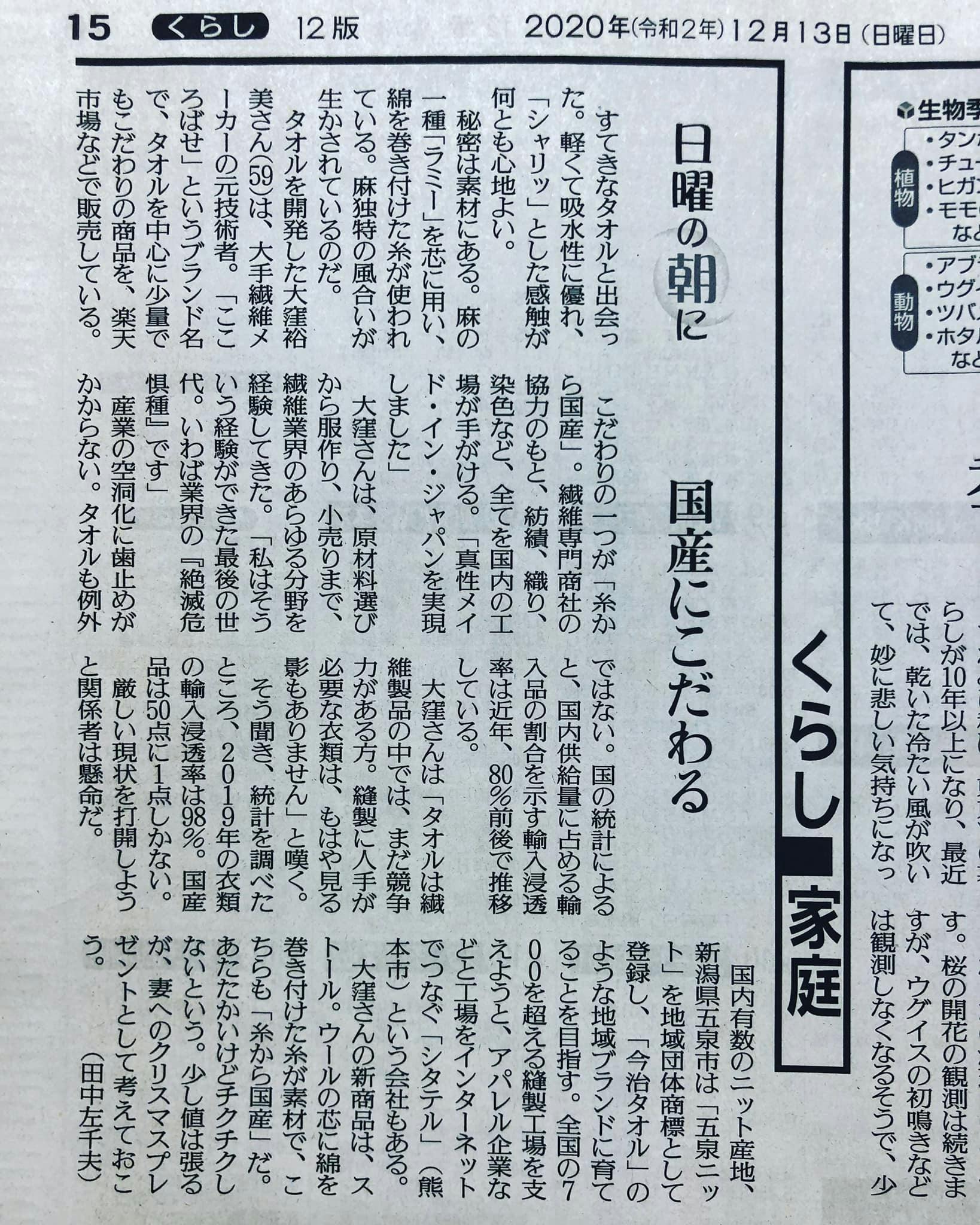 実は昨年末のことなんですが、読売新聞の取材を受け全国版の日曜朝刊にこころばせのことをご紹介いただきました。