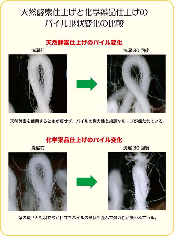織上がったタオルは染色前に、通常苛性ソーダ(水酸化ナトリウム)で高温短時間で行う精錬(コットンの油脂を取り除いて染色性と吸水力を上げる工程)を、悠閑タオルでは繊維を傷めずパイル形状を維持してくれる天然酵素で時間をかけてじっくり行います。