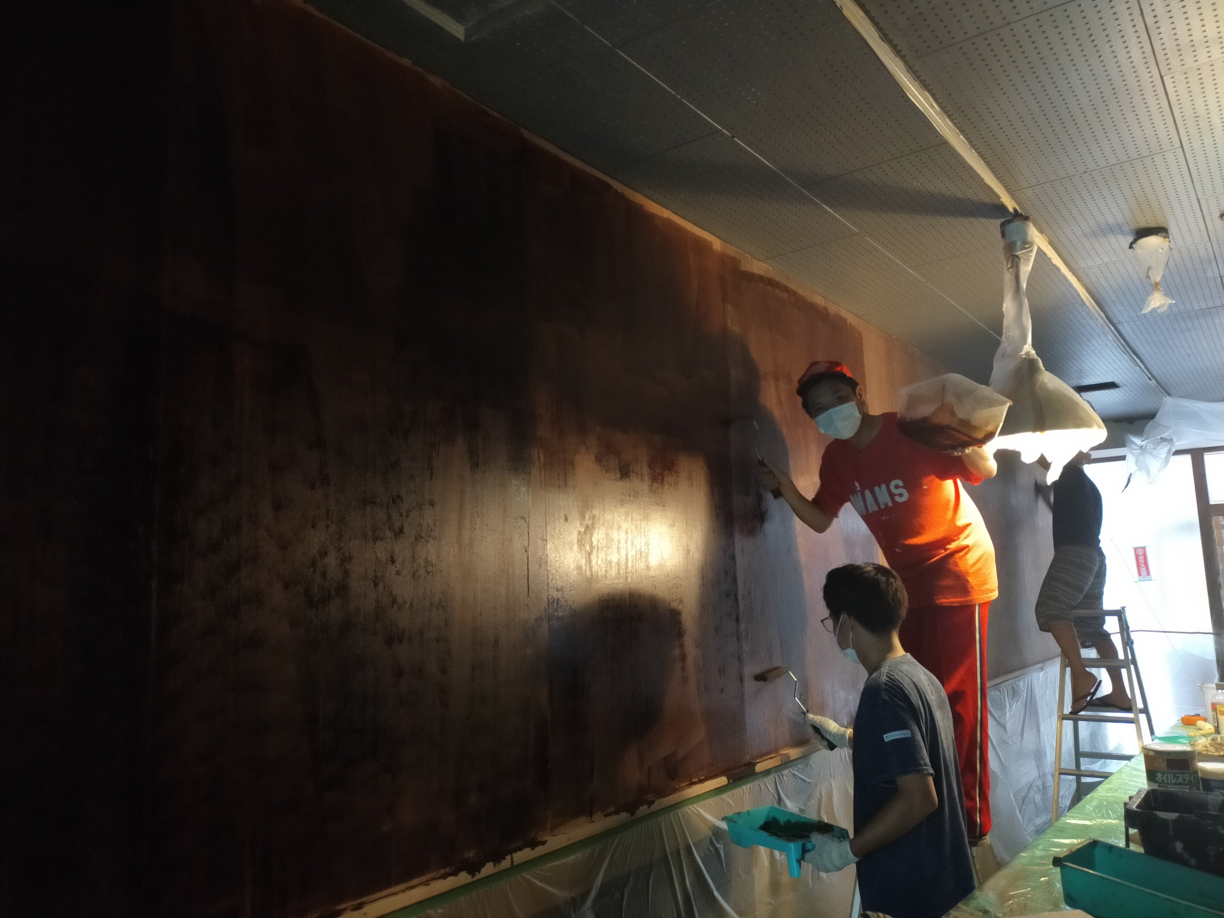 2度塗りをすることで、ムラをなくしていきます。人の力加減によってすごく濃くついたりローラーの跡がついたり、なかなか難しい!