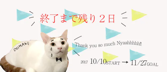 2017/11/25 17:09ついに終了まで残り2日となりました。しばらく活動報告ができてませんでしたが、 いろいろと動いております! 今回、ストレッチゴールを達成したら大きなイベントを!と思っていましたが、このクラウドファンディング中も、いろいろなボランティアさんと交流をしたり、保護活動を進めるなかにおいて、やはり保護動物たちの出会いの機会をもっと増やすべきだと思いました。 シェルターはどこもいっぱいです。 ボランティアさんたちも、自宅にたくさんの猫を抱えています。 みんな、そこでは手厚くケアをされ保護されていますが、たくさんいる中の1頭であることは変わりなく、本来であればちゃんとした家族にめぐりあうことが最終ゴールです。 さらに、譲渡が進まないと次の保護ができません。まだまだ「理由なき殺処分」から救い出すべき命はたくさんあります(とくに子猫)。 なので、わたしたちは今回の資金を、ミニブース展開をして譲渡会を開いていくことにしました。 保護活動に関心がある人以外にも知ってもらえるような譲渡会を小さな規模でもコツコツやっていくほうが大切なのでは?と、思いました。 なので、大きなイベントやブースもやっていきたいのですが、まずはコツコツと小さな譲渡会を開いて保護主さんの負担を減らし、新しい家族と動物が出会えていくようなお手伝いをわたしたちができたらいいなと考え、 そこに、今回の資金でつくることができたパネルを展示したりしていきたいと思います。 とにもかくにもあと2日!!何卒よろしくお願いいたします!!!!! もっと見る