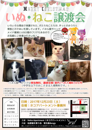 2017/12/04 12:2312/23(土)譲渡会のチラシができあがりました。写真は今のところ参加予定の犬と猫です。みんなとっても可愛いです。当日は地域の方に開かれたかんじの譲渡会をめざしています。 ◎譲渡会場前ではパネル展と移動販売カーでのフリマ等やります ♥ハンドメイド雑貨、USED衣類、手作りリース、チャリティグッズなどなど。 ◎譲渡会場(室内)への入場はお一人様500円をいただくことになっています。今後も譲渡会を継続していくための資金に使わせていただきますのでご理解ください。(中学生以下は無料) ◎譲渡会場では猫だけでなく猫に関する本もいろいろおいてます。 ◎当日来場してくれた小学生以下のおともだちにはささやかなクリスマスプレゼントをご用意しています。 いい出会いがありますように。動物愛GO〜┏( ^o^)┛ ----------------------------------------- こちらのイベントはプロジェクトによって集まった資金をもとに開催させていただきますので、こちらでご報告させていただきました。 もっと見る