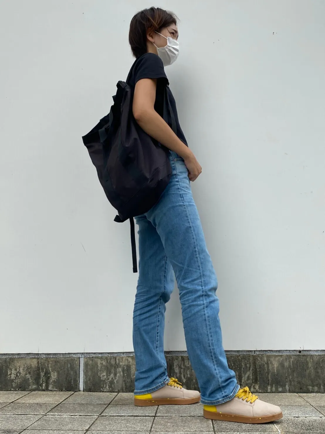 シンプルな黒のティーシャツにリュックでちょっとお出かけスタイルに!