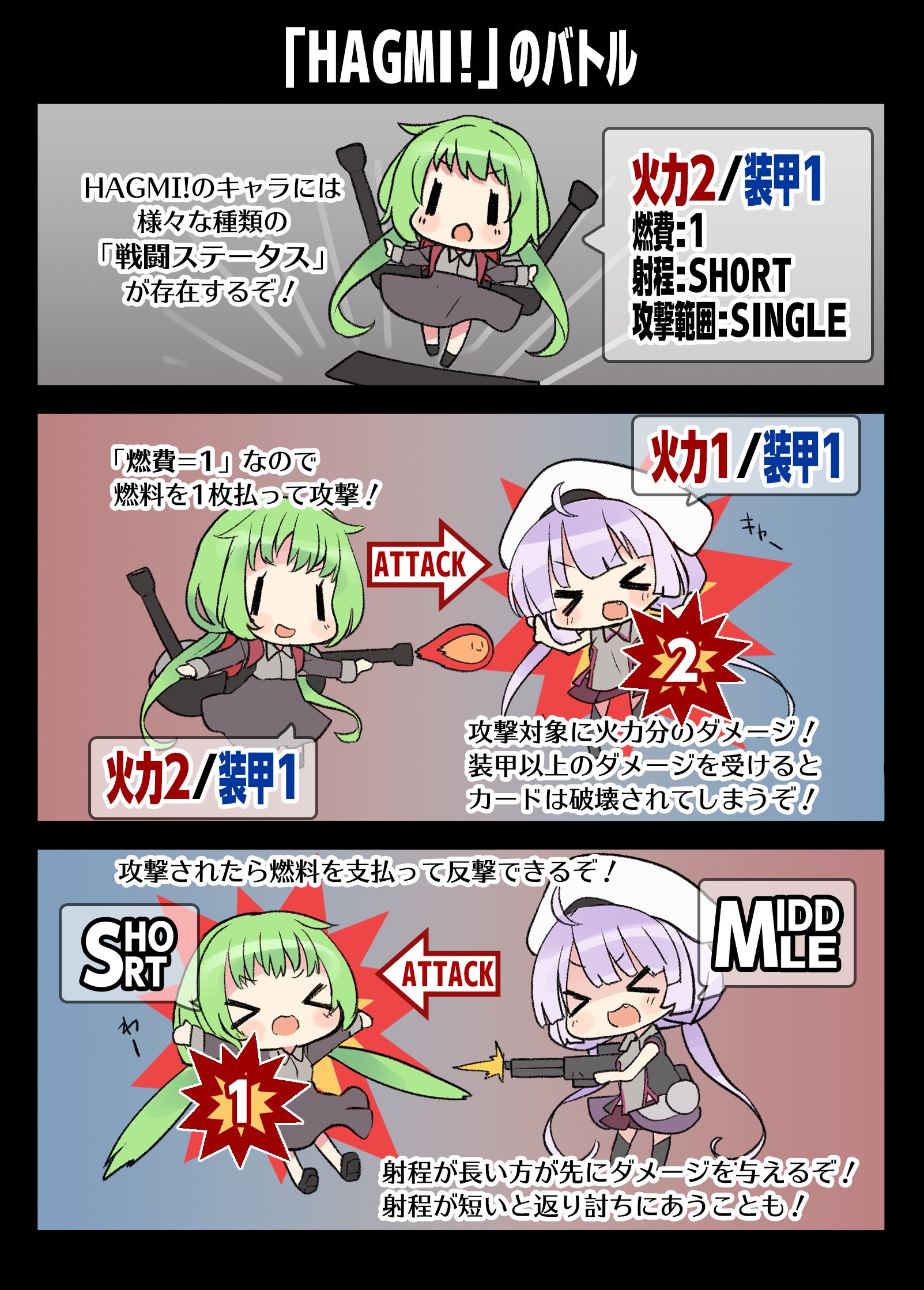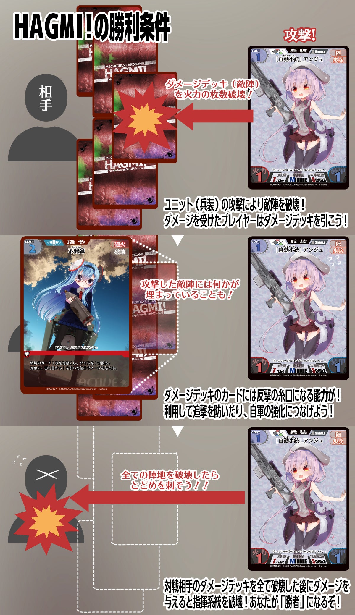 HAGMI!では「守備力以上のダメージを受けたら破壊される」というカードゲームのお約束に則った上で、「攻撃や反撃にはコスト(燃料)が必要」「射程が長いものから先にダメージを与える」等、兵器的な要素を取り入れています。
