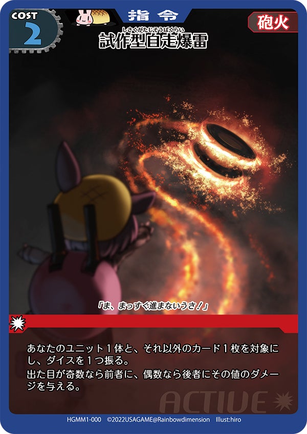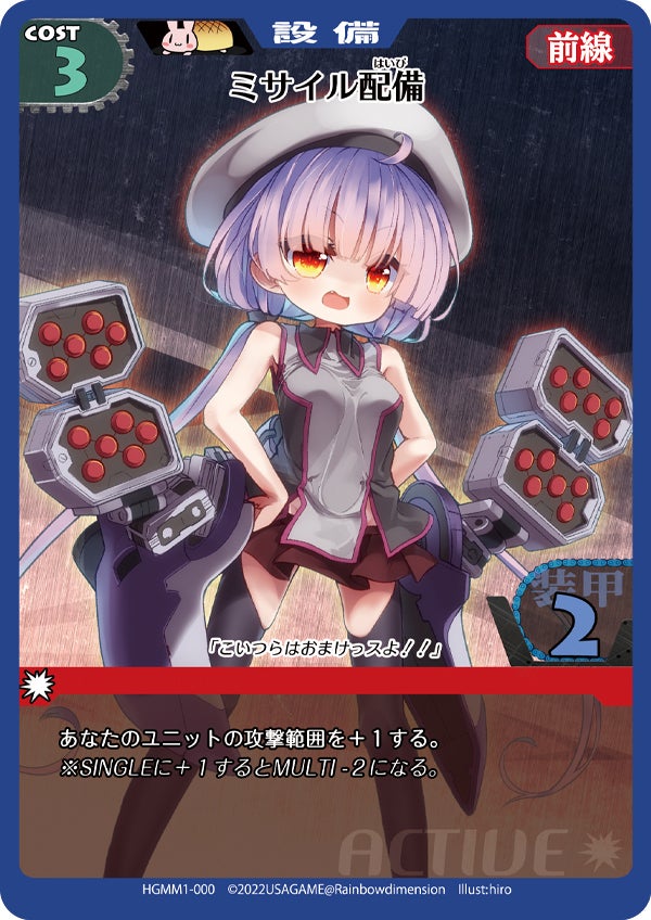 2021/07/14 20:22USAGAMEのひろです!!今回は、本作より登場する新規キーワード等に関する解説です。補修はダメージデッキを回復する処理で、事実上のライフ回復を行う処理のことです。既に数枚のカードにおいて存在する処理ですが、記述が長く、スキル枠が2つのカードなどでは用いるのが難しいと判断したため、今後のデベロップを見据えてキーワード化いたします。いずれの場合でも「表向きのカードは一時しのぎでしかない」ことに変わりはありません。充電・電力は「燃料や弾薬でない行動のコスト」として代用されてきた「格納」を、他の格納と区別するために用いるものです。電力は「充電」によってカードに保持され、そのカードのスキルなどによって使用されます。特に設備カードやトークンなど「燃料を用いにくいもの」などでの仕様も想定しております。これまでの格納を行うカードのうち電力を用いた表記に置き換わりそうなものは、再録時にテキスト更新を行った後に初めて適用されます。また、電力カウンターはセット内に封入される予定です。上記2点は主に表記、処理の最適化を目的としたものですが、これによって可能になるデザインも色々と存在しそうなので、今後の新カード発表をお楽しみに!本作より、一部のカードに「装甲値を持たないカード」が現れます。これは「ダメージの蓄積によっては破壊されない」事を意味しますが、他のスキルなどで破壊することは可能です。これによってより強力な設備カードを開発できたり、妙なカードを作れたりと、より自由なデベロップが行えるようになるでしょう。これまでの集大成であり、これからへの第一歩である本作「HAGMI!!HeavyArmedGirlsMission!!」のクラウドファンディングは、終了まで残り2週間となっております。現在はまだ目標達成には至っていませんが、より楽しく、より遊びやすい様にデッキ内容なども合わせて試行錯誤を続けております。絶対に出版したいと思って開発中ですので、無事発売ができるように何卒応援のほど、よろしくお願いいたします!!USAGAME@Rainbowdimension ひろ もっと見る