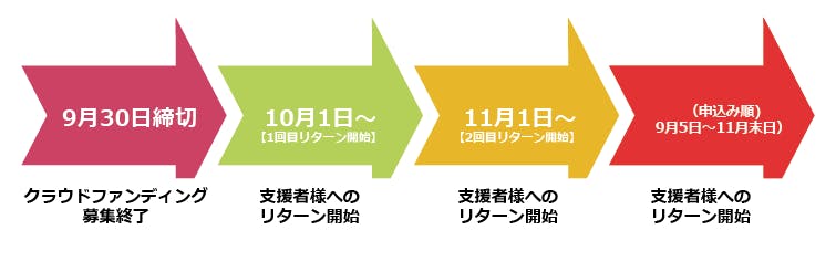 ◯ 商品引渡しまたは役務提供の時期:各プロジェクトが募集期間内に成立した場合のみ、支援金の決済が行われ、約定されたリターンを得る権利が発生します。なお、リターン毎の発送(履行)時期は各プロジェクトの記載・連絡に準じます。諸般の事情により遅延・遅配が生じる場合は、プロジェクトオーナーより記載・連絡されるものとします。