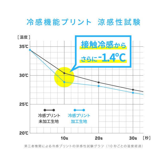 冷感プリント未加工と冷感プリント加工生地では、「10秒時点では-1.4℃の差」の生地温度が下がります。
