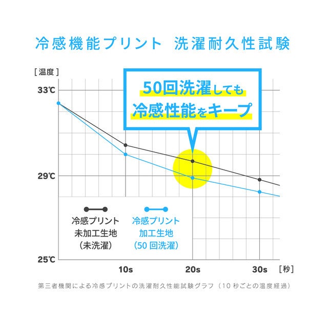 冷感プリント未加工(未洗濯)と冷感プリント加工生地(50回洗濯)の比較では、「20秒時点では-0.4℃の差」となります。