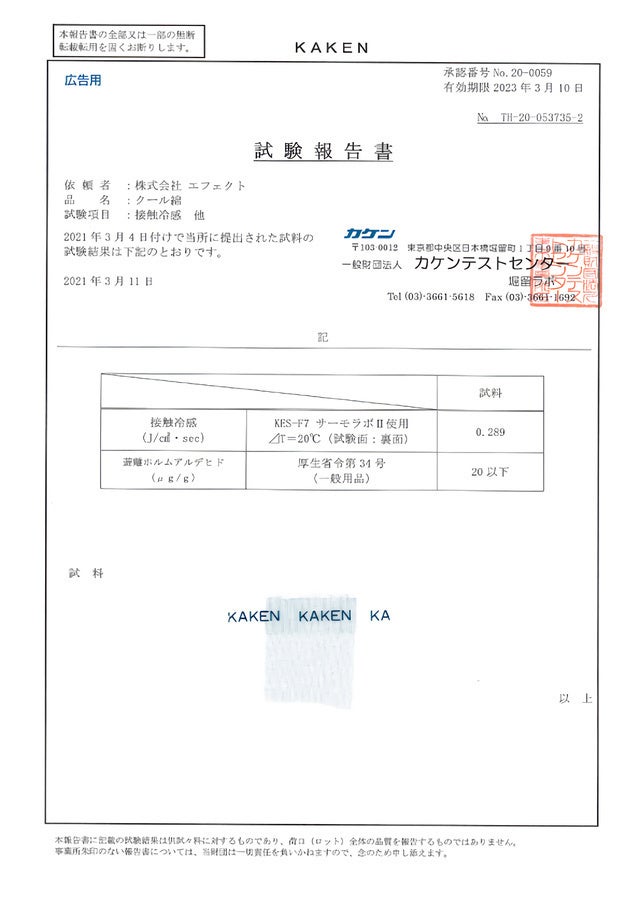 公的機関で接触冷感値を計測しました。綿100%でヒンヤリ冷たいのが実証されました。また、有害物質であるホルムアルデヒド含有量が厚生省令で規制されいる肌着の基準を下回っています。
