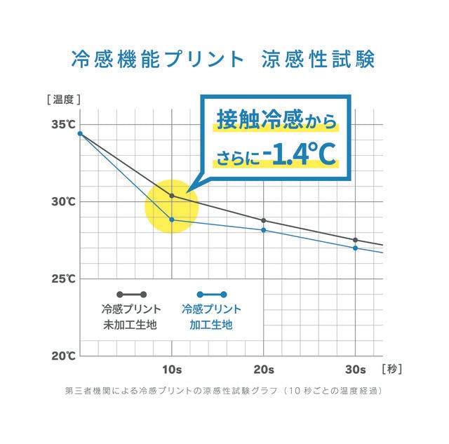 冷感プリント未加工と冷感プリント加工生地では、「10秒時点では-1.4℃の差」の生地温度が下がります。