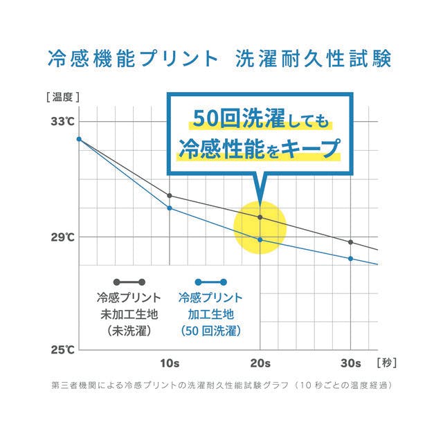 冷感プリント未加工(未洗濯)と冷感プリント加工生地(50回洗濯)の比較では、「20秒時点では-0.4℃の差」となります。