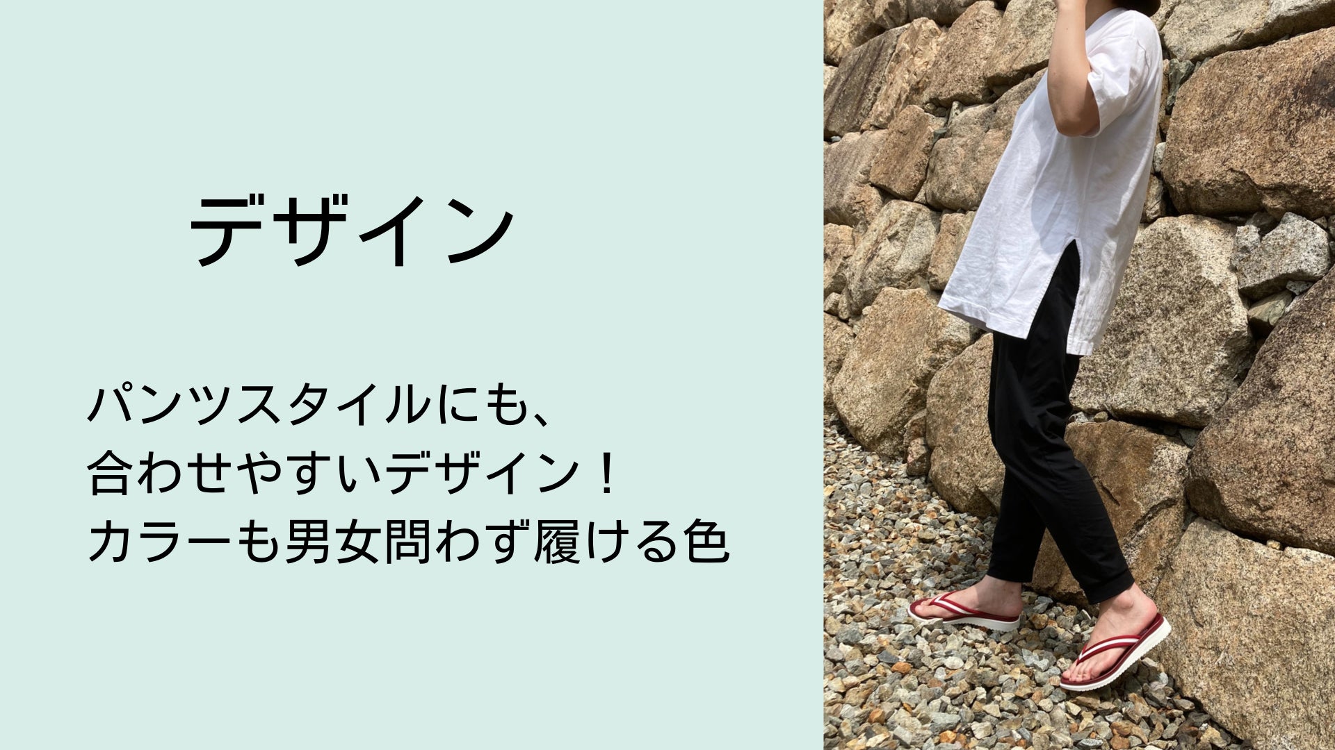 草履というと、着物にしか合わないような古風なイメージですが、【足育サンダル】はパンツスタイルにも合わせやすい、カジュアルにもお使い頂けるデザインに仕上げました。
