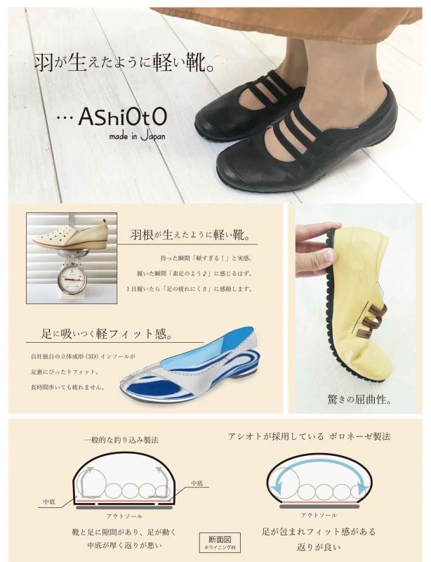 アシオトの靴を履いたお客様は口を揃えて「軽すぎる!」といつも驚かれます。その秘密は靴底です。
